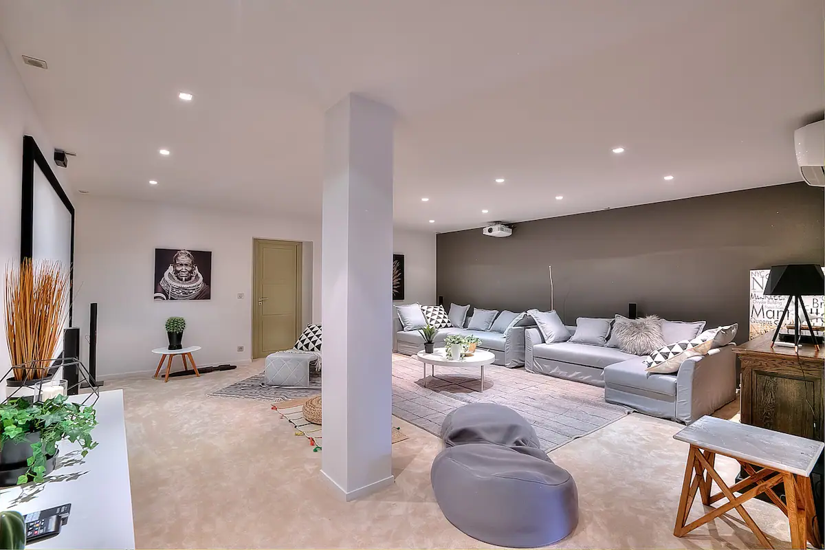 La villa se compose d’un salon spacieux qui donne sur une grande cuisine entièrement équipée, conçue pour répondre à tous les besoins culinaires. Il abrite 4 chambres bien aménagées, chacune accompagnée de sa propre salle de bains et équipée d’une télévision, garantissant ainsi des retraites personnelles pour la détente et le divertissement. En outre, la villa dispose d’une salle de cinéma, qui comprend deux canapés convertibles pour des couchages supplémentaires, offrant ainsi un endroit confortable pour les soirées cinéma.