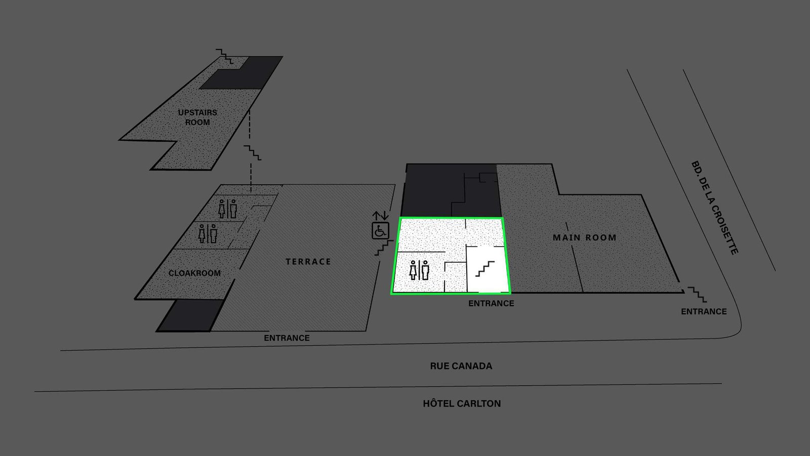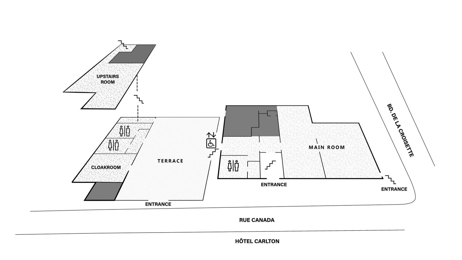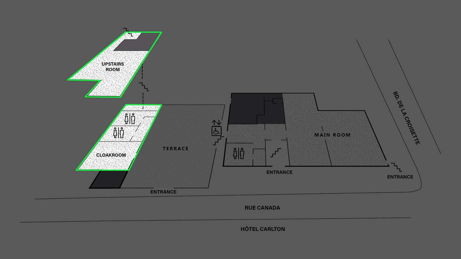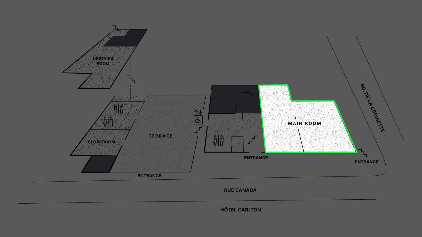 – Terrace & Annexe: Together, these provide 250m² of space. The terrace covers 90m² and is complemented by a 55m² indoor VIP room, suitable for 120 seated or 230 cocktail guests, with sound systems installed.