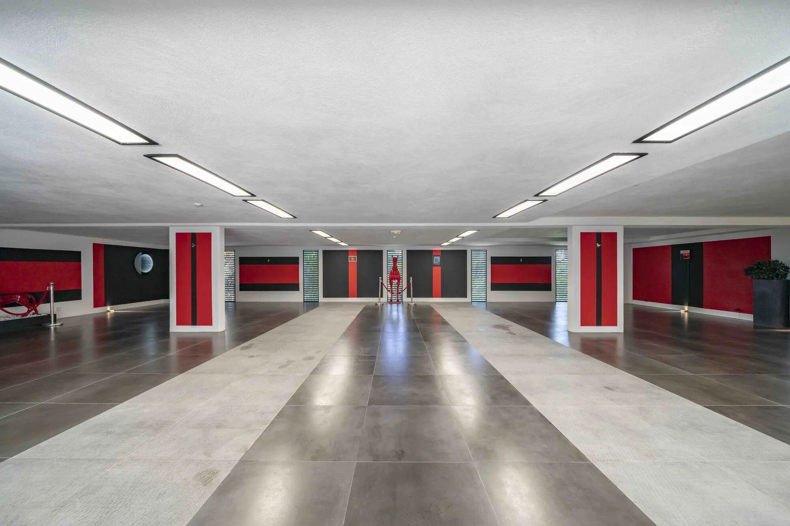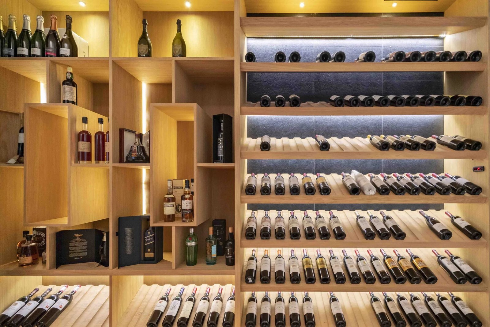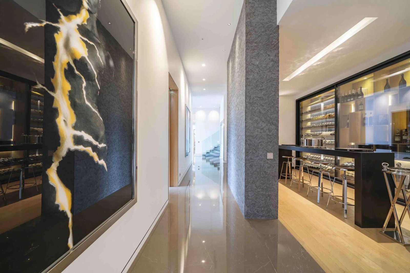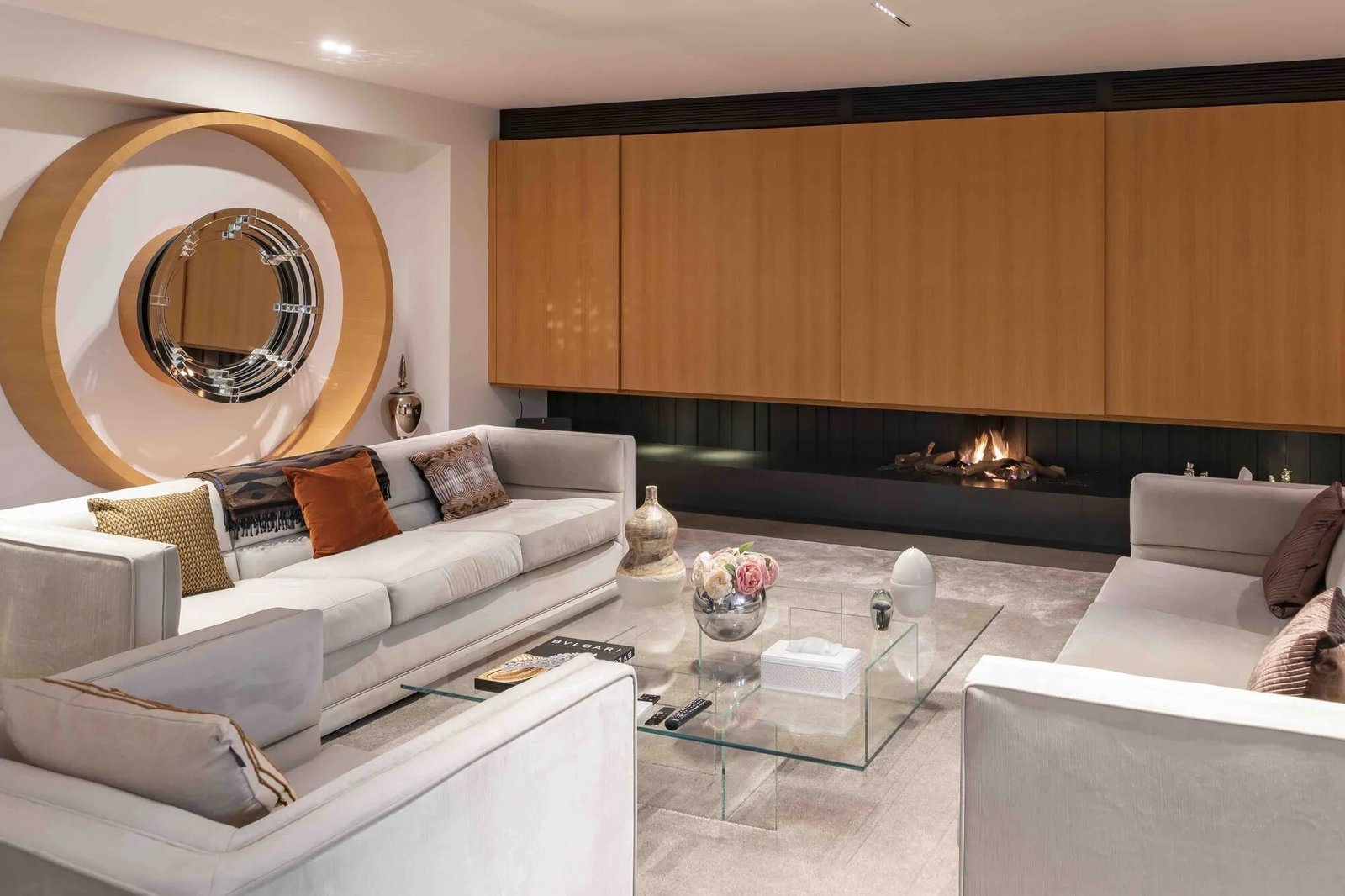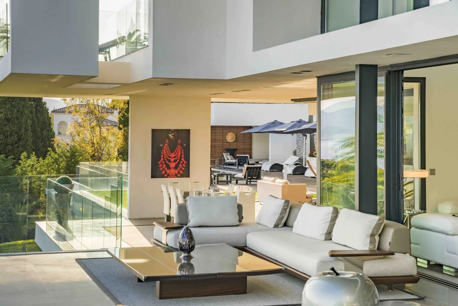 The ground floor features a vast living area with floor-to-ceiling glass walls that retract completely, merging indoor and outdoor spaces. The spacious terrace wraps around into the beautifully landscaped garden, perfect for relaxing or entertaining. Guests can enjoy multiple seating areas, a dining room that seats 12, a hidden kitchen, and a guest bathroom. The garden is a tranquil oasis with lounge furniture, a fire pit, and stunning infinity pool.