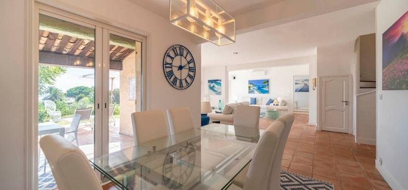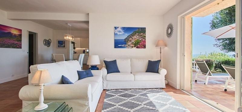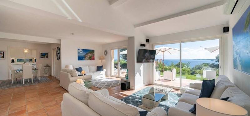A beautiful contemporary property with spectacular views over the sea towards the Lérins Islands, located just a 10 minutes drive into Cannes centre. Large living room with comfortable sofas opening up onto a terrace with sea views.