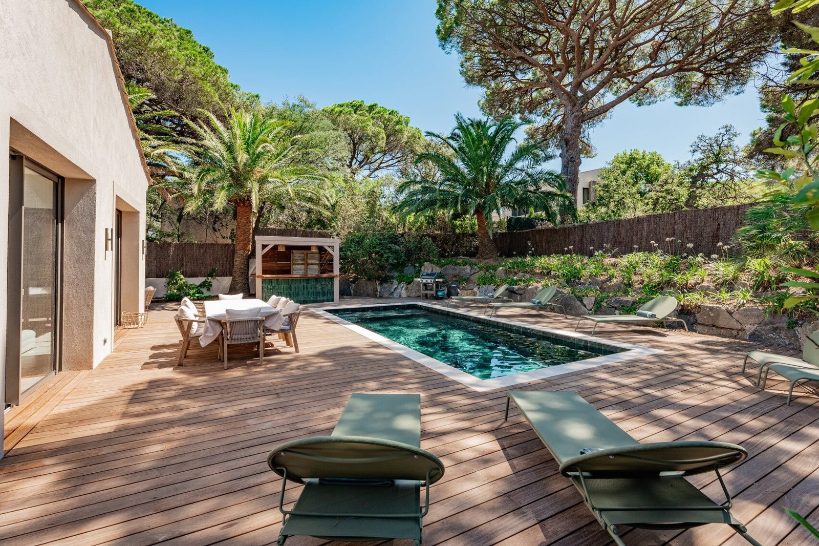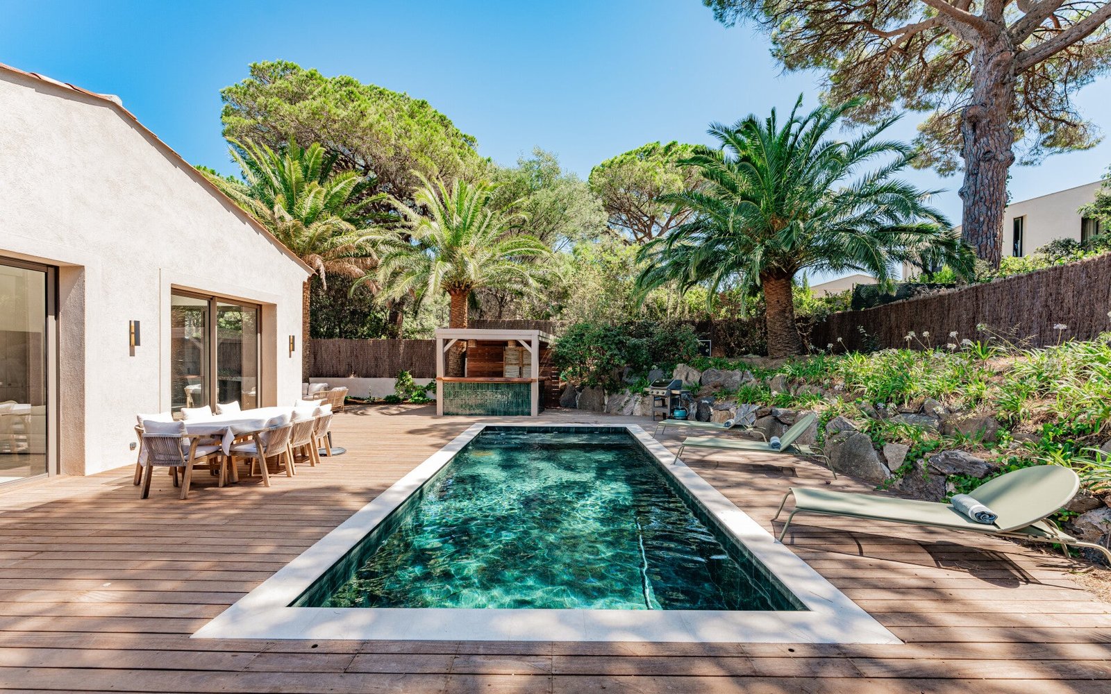 Charming 4-bedroom, 5-bathroom villa located in the private Parc des Salins, just steps from the beach and 4 km from Saint-Tropez centre. Fully renovated in 2023, it offers modern comfort with Mediterranean elegance. Each bedroom has its own bathroom, and the villa accommodates up to 10 guests.