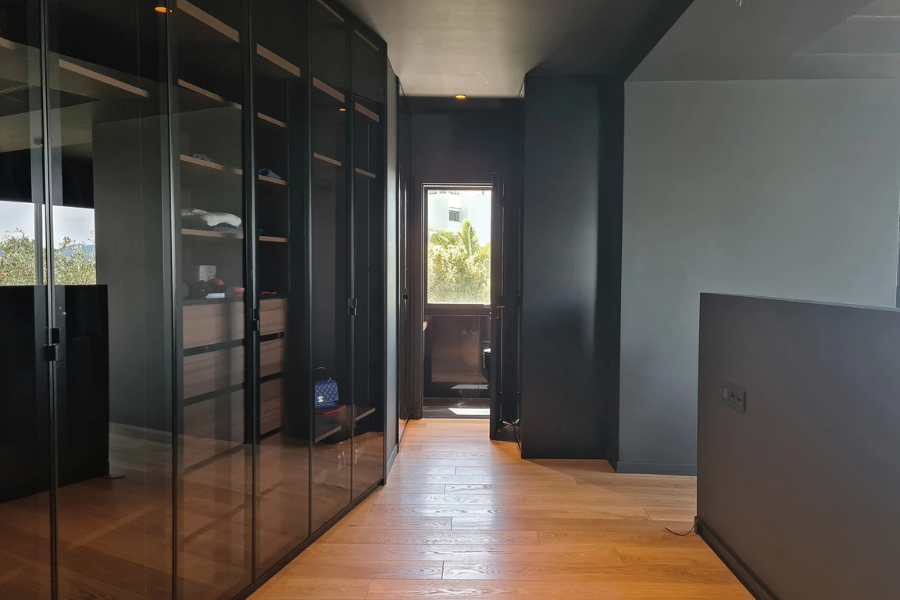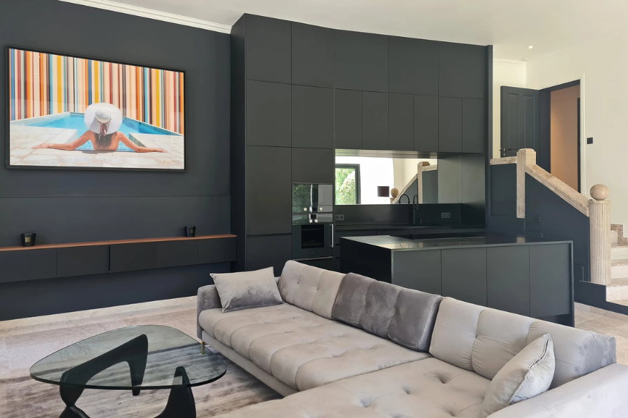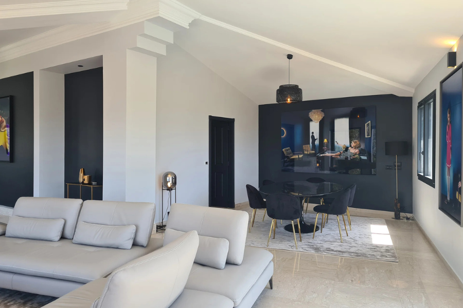 Showcasing a contemporary and refined style, the villa offers a sophisticated décor where modern furnishings and ultimate comfort blend seamlessly. The interiors are bathed in natural light through large glass doors that open onto the outdoor spaces, creating an atmosphere that is both warm and elegant.