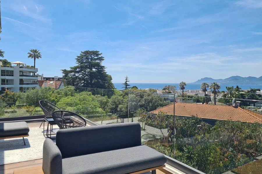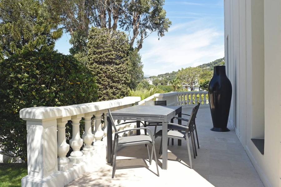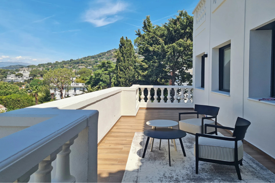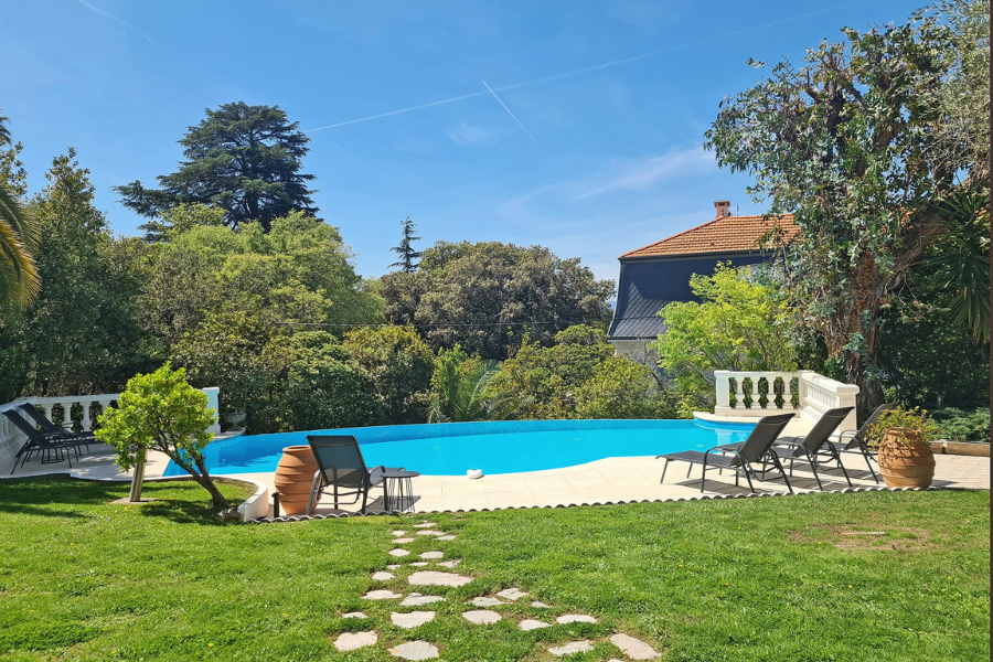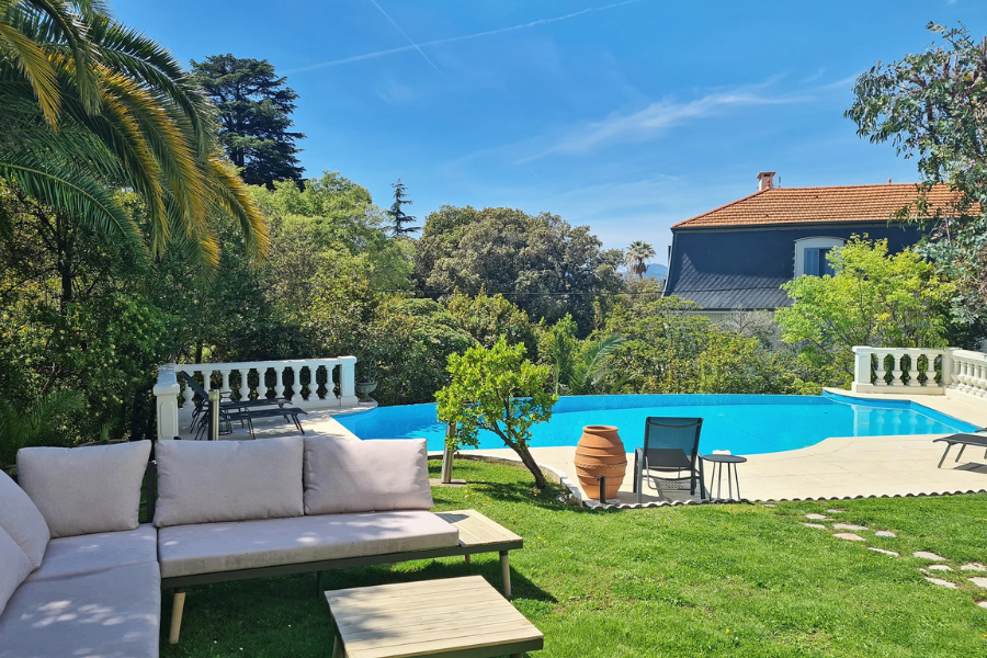 The outdoor spaces are designed to take full advantage of the Mediterranean climate. The infinity pool, surrounded by comfortable sun loungers, provides an idyllic setting to unwind while gazing at the sea. A stylish outdoor lounge area offers a perfect spot for relaxation, while the terrace features an intimate dining space that can be extended onto the lawn for larger gatherings. Nestled at the end of a quiet cul-de-sac, the villa guarantees peace, privacy, and an exclusive retreat in the heart of Cannes.