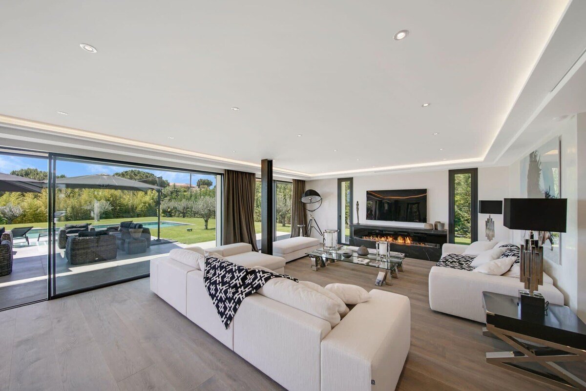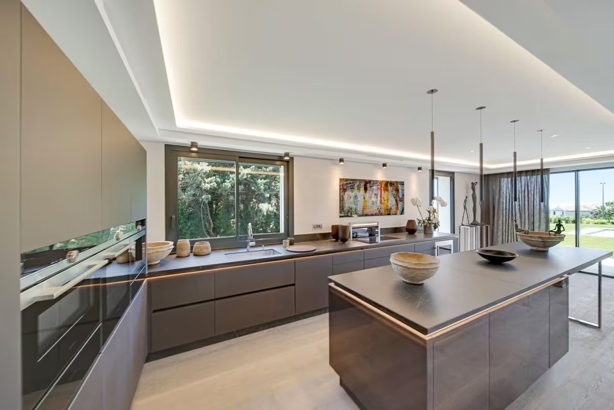 The lounge is a testament to luxury, with electronic plate glass windows opening to the garden and pool, furnished with plush sofas, a television, and an ethanol fireplace for cozy evenings. Adjacent, the dining area welcomes gatherings around a large table for 10, complemented by a fully equipped kitchen. The kitchen boasts an American refrigerator, microwave, oven, and a Siemens coffee machine, alongside an induction cooker, wine cellar, and a central island that doubles as a high table for five.
