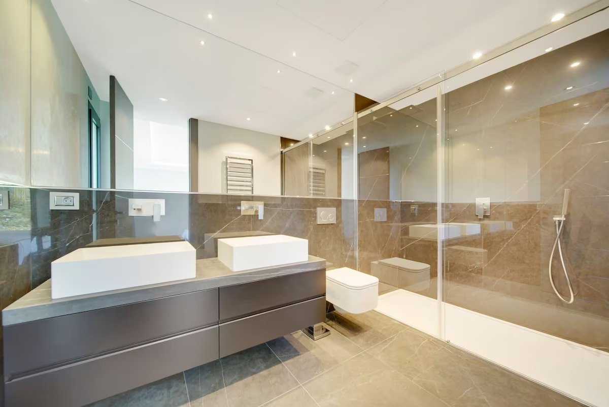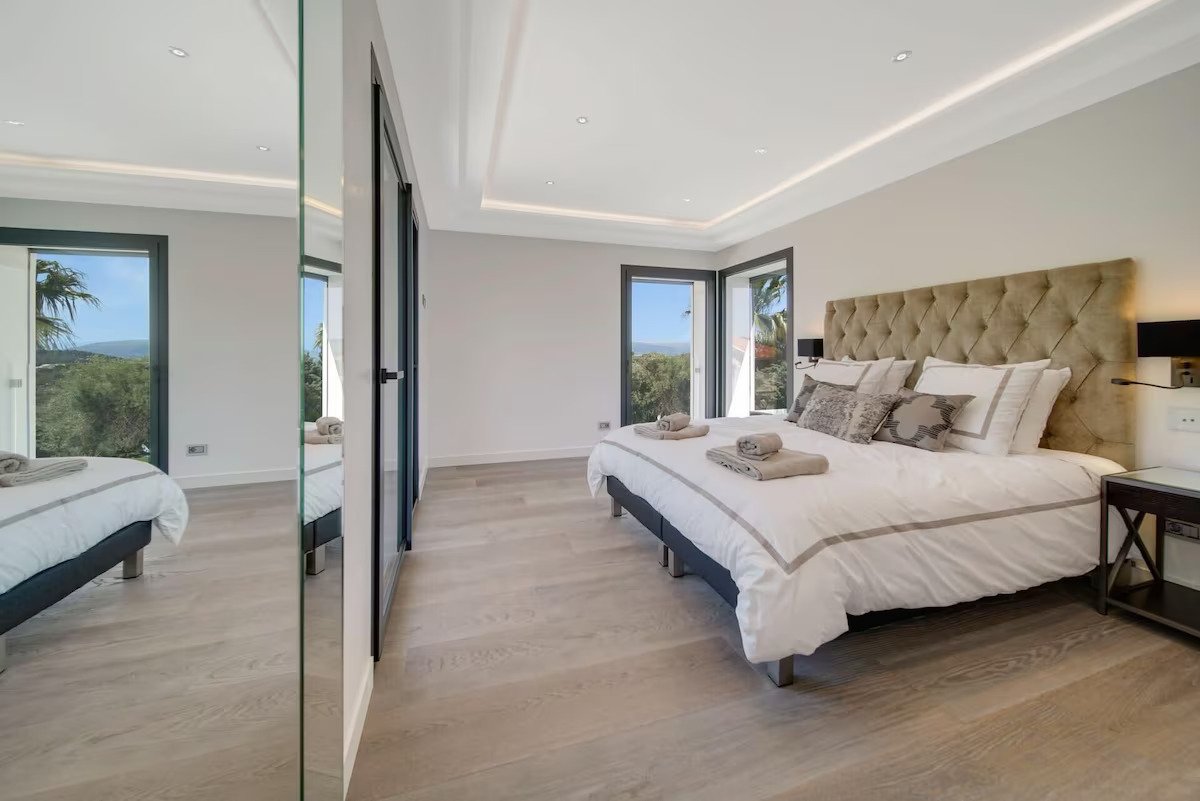 Ascending to the first floor, Villa Malibu continues to impress with three more bedrooms, including an independent suite with a private terrace offering stunning views, and two bathrooms for unparalleled luxury. Each bedroom is meticulously designed, providing hill views, dressing rooms, and sophisticated bathroom facilities.