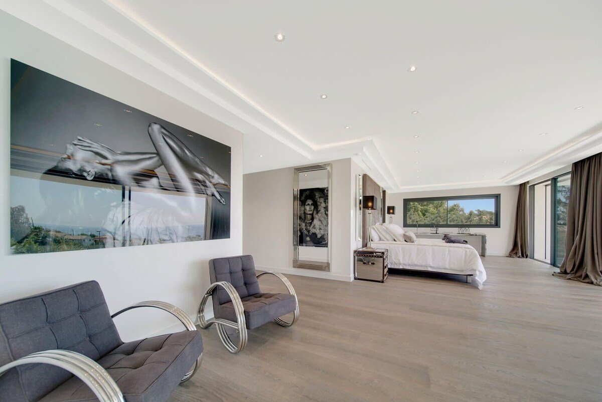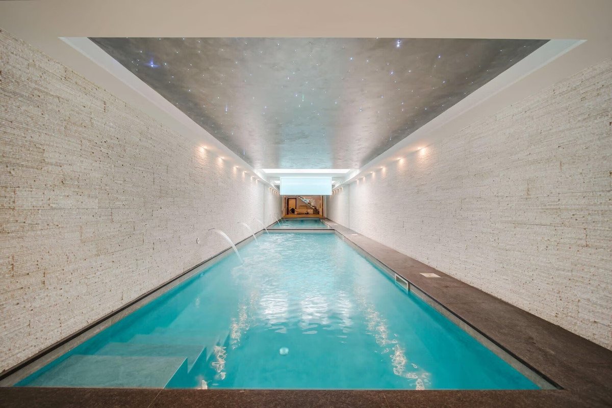 Below, the villa surprises with an indoor heated swimming pool, a fitness area, a hammam, and even a private cinema room, promising entertainment and relaxation. The laundry room and garage add practicality to luxury.