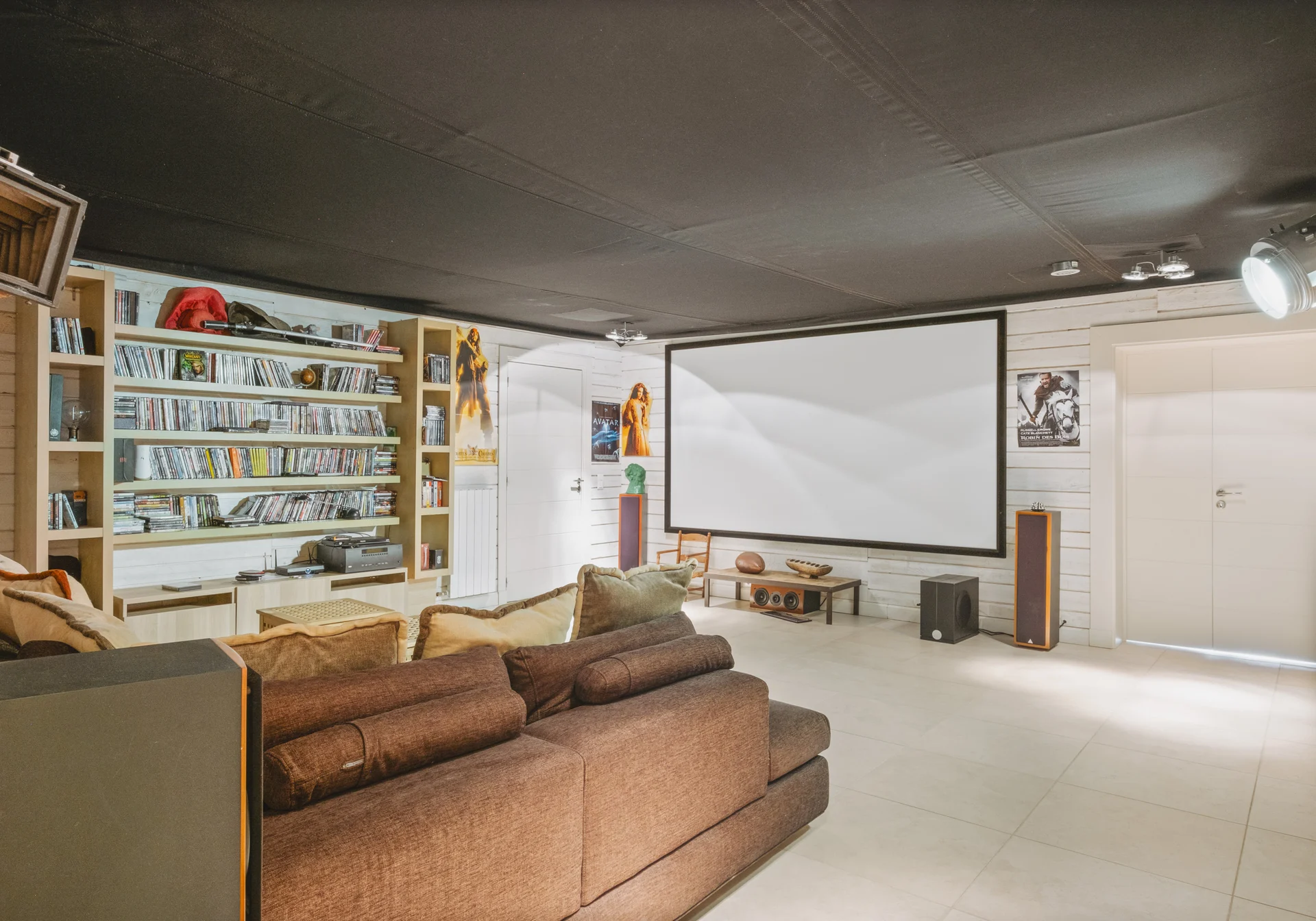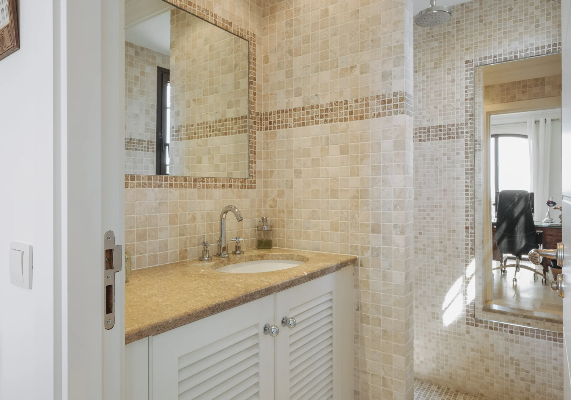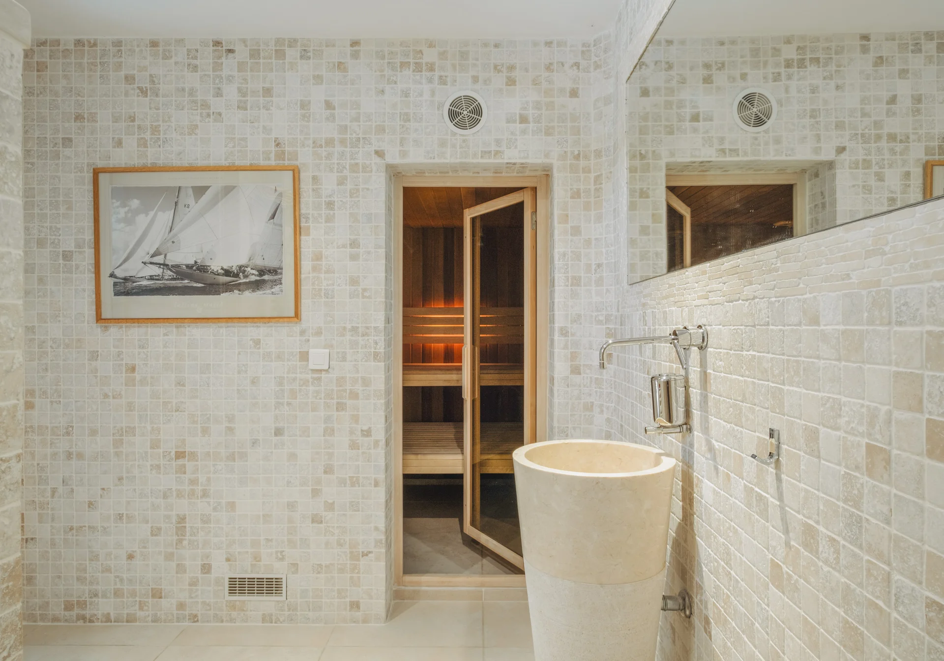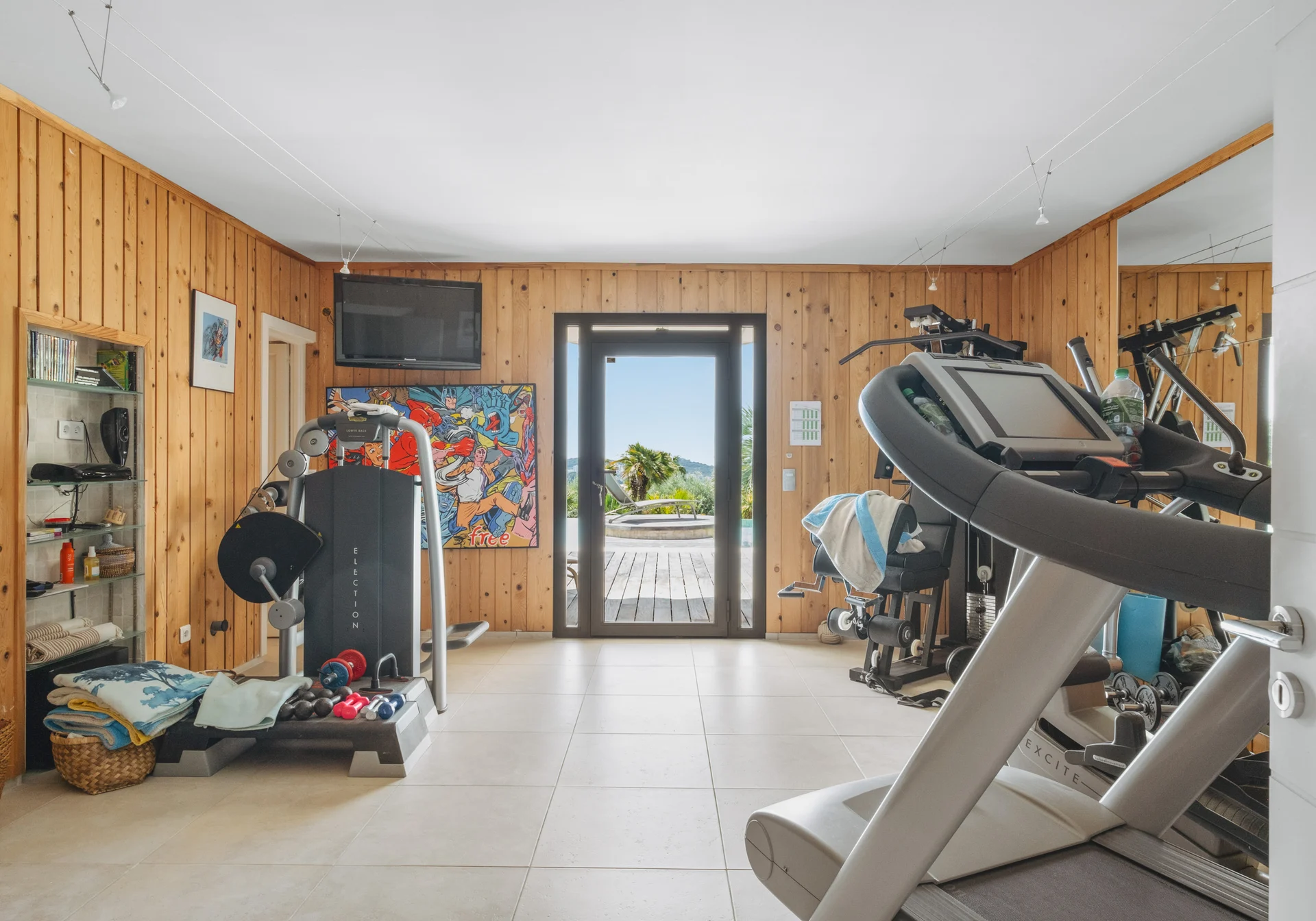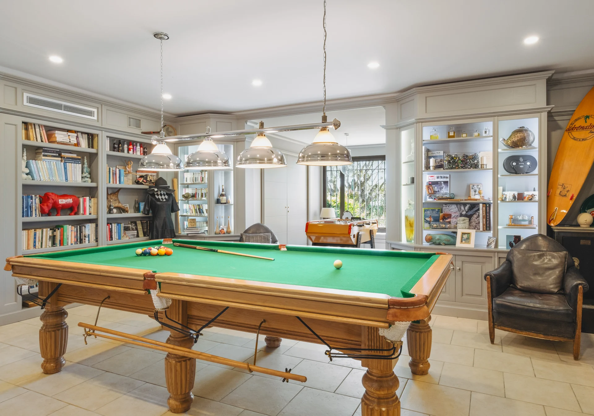 The home is set on three floors, connected by an elevator. The ground level offers an open-plan living and dining area that leads directly to the outdoor terrace, a fully equipped kitchen with a pantry and laundry room, and the primary suite, which features a large dressing room and a private terrace. The first floor includes four en-suite bedrooms, one with an attached office, and two other bedrooms that each have only an en-suite shower, sharing an independent guest toilet. The lower level includes a spacious TV lounge with a projector, a games room equipped with a billiard table and foosball table, and a wellness area fitted with a sauna, hammam, bathroom, and home gym.