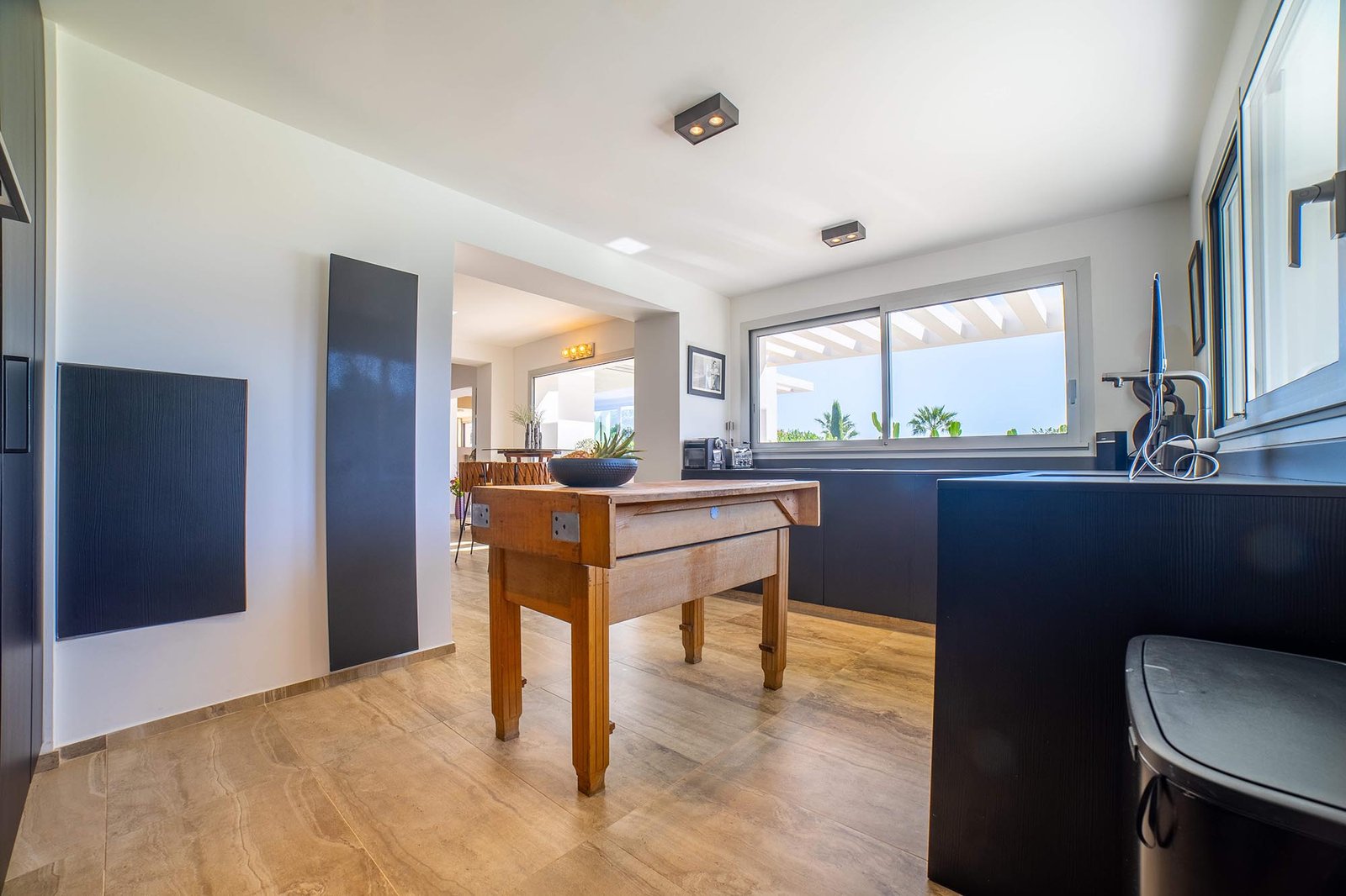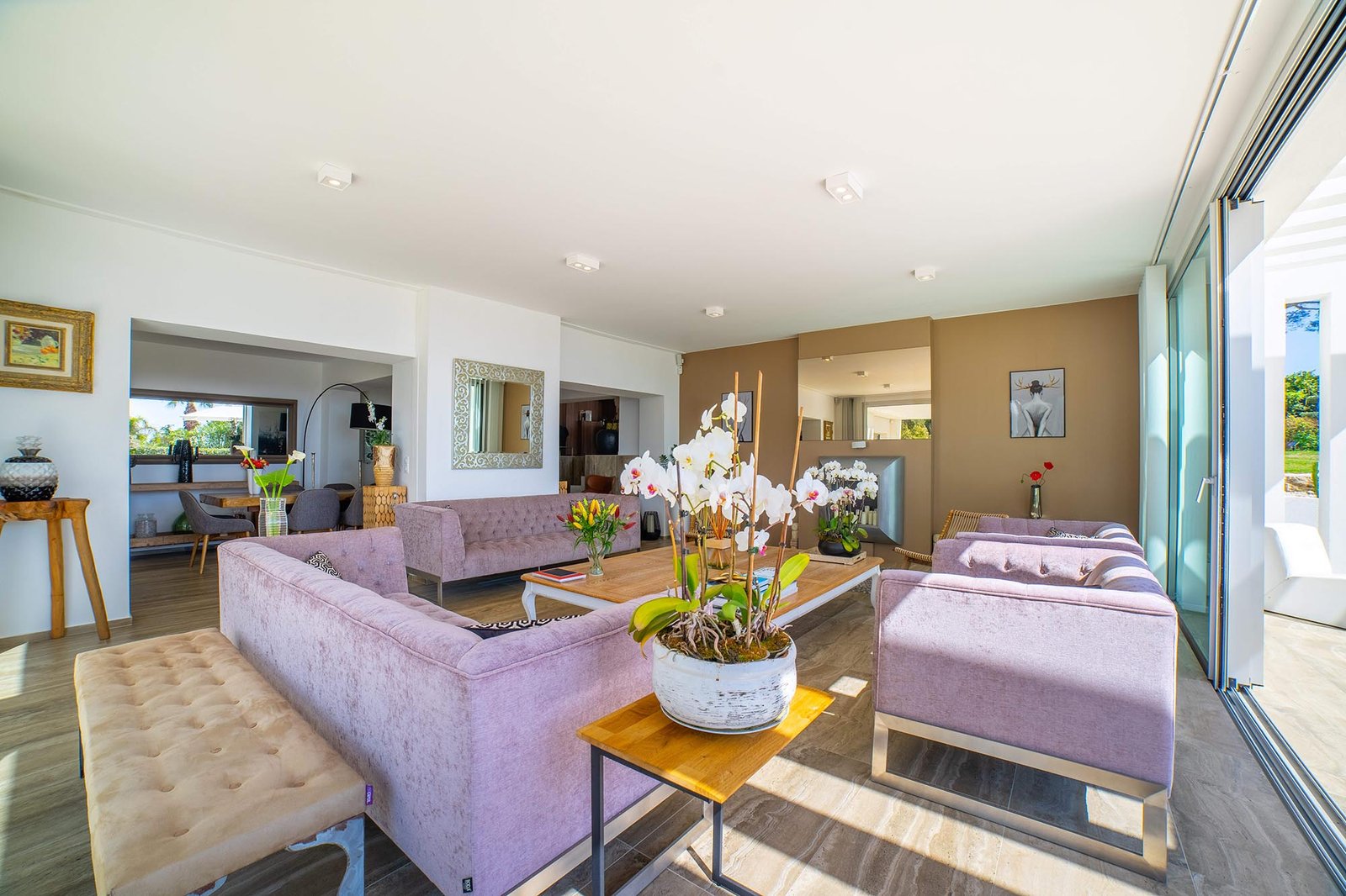 Upon entering, one is greeted by a spacious living room that effortlessly flows into an elegant dining area. The state-of-the-art American kitchen comes fully equipped, ensuring every culinary endeavor is a delight. The villa houses four exquisitely designed en-suite bedrooms, each echoing the luxury and attention to detail found throughout the home. Of these, the master bedroom stands out, offering unparalleled comfort and sophistication. For those desiring a touch more privacy, there’s also a separate apartment that features an additional en-suite bedroom.