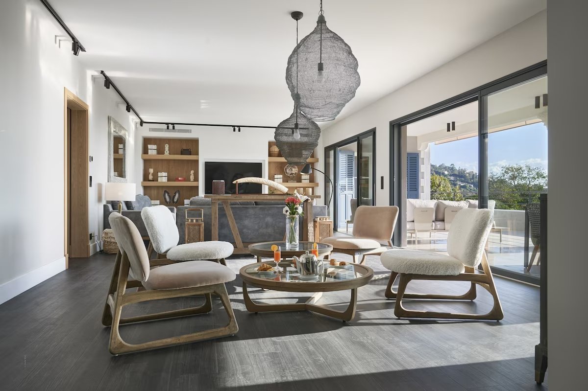 The villa boasts air-conditioned accommodations, each featuring a private pool and a cozy fireplace, creating an ambiance of warmth and exclusivity. The living spaces extend to patios, allowing guests to indulge in the beauty of their surroundings. The interior is thoughtfully furnished with dining tables and kitchen islands, complementing the spacious kitchen or kitchenette. Equipped with a refrigerator, stovetop, microwave, and an array of cookware/dishes/utensils, the kitchen invites guests to explore their culinary skills in a refined setting.