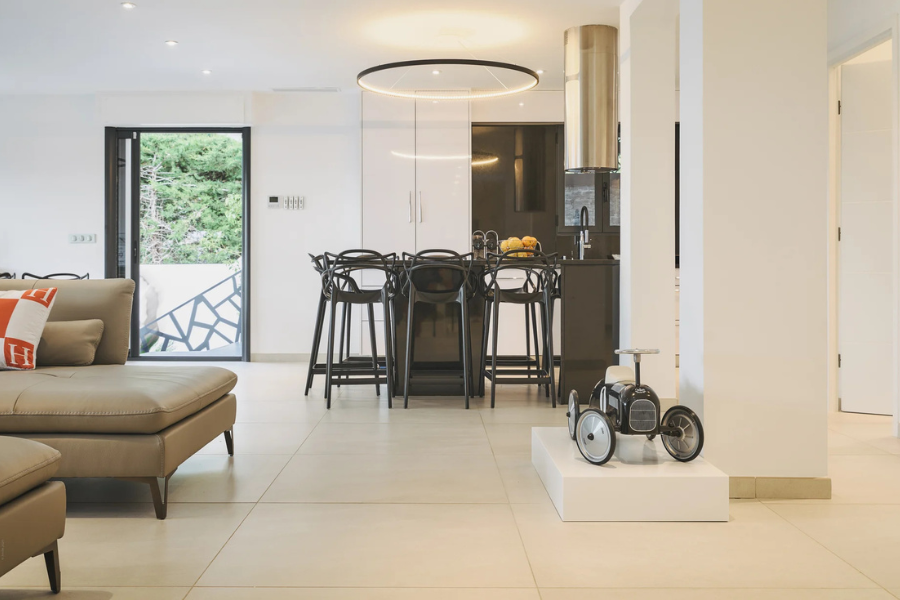 Recently renovated, the villa showcases a sleek, contemporary design, featuring elegant dark stone accents, sophisticated furnishings, and refined décor that create a stylish yet inviting atmosphere.