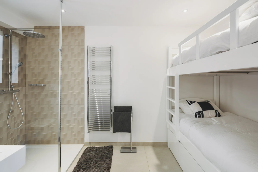Spanning two levels, the villa’s ground floor hosts two comfortable en-suite bedrooms, a laundry room, and a fully equipped gym with views overlooking the pool. The first floor is dedicated to spacious living, with an open-plan lounge, a dining table for 12 guests, and a modern kitchen with a cozy breakfast nook. This level also features a guest toilet, a master suite with an additional bunk bed area (ideal for families), a dormitory accommodating three young guests with shared bathrooms, and another en-suite bedroom.