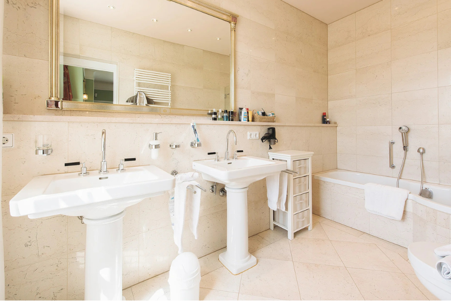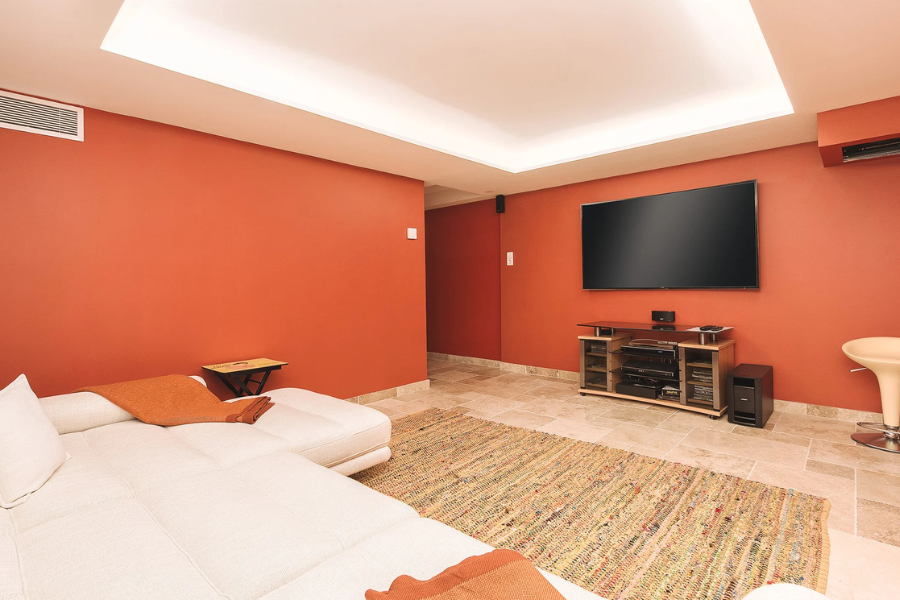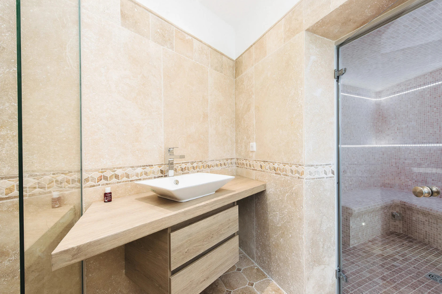 Spread across three levels, the villa’s layout is both functional and sophisticated. The lower level includes a cozy TV lounge, one en-suite bedroom, a wine cellar, a laundry room, and a wellness area complete with a hammam and gym. The ground floor features a bright and spacious living room, a dining area, a semi-open modern kitchen, and two additional en-suite bedrooms. The top floor houses two more luxurious en-suite bedrooms.