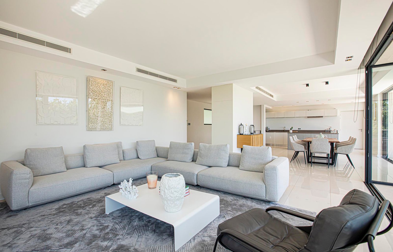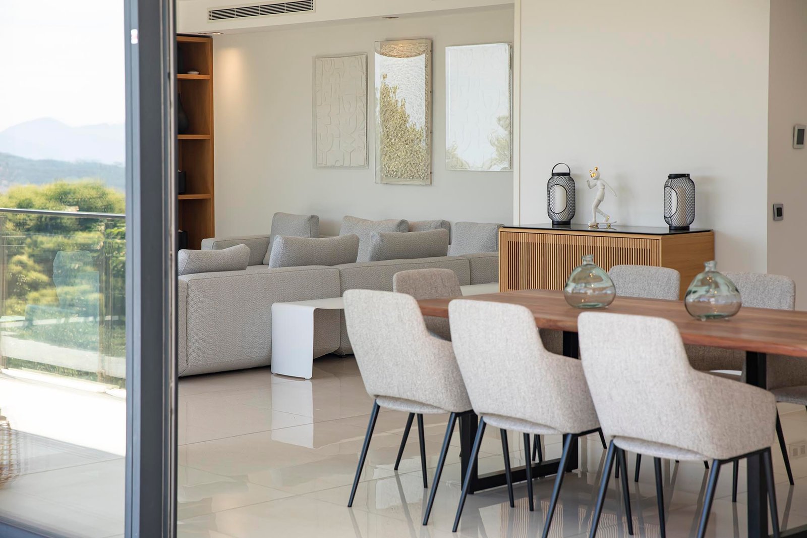 The villa is thoughtfully arranged over two levels, providing distinct areas for entertainment and relaxation. The reception area includes a grand living room furnished with designer pieces, an ethanol fireplace for winter warmth, a television, and a dining area. The open-plan, fully equipped kitchen with high-quality appliances seamlessly integrates with the living space, creating an ideal setting for social gatherings. Additionally, there is a guest toilet and several outdoor terraces and sitting areas.