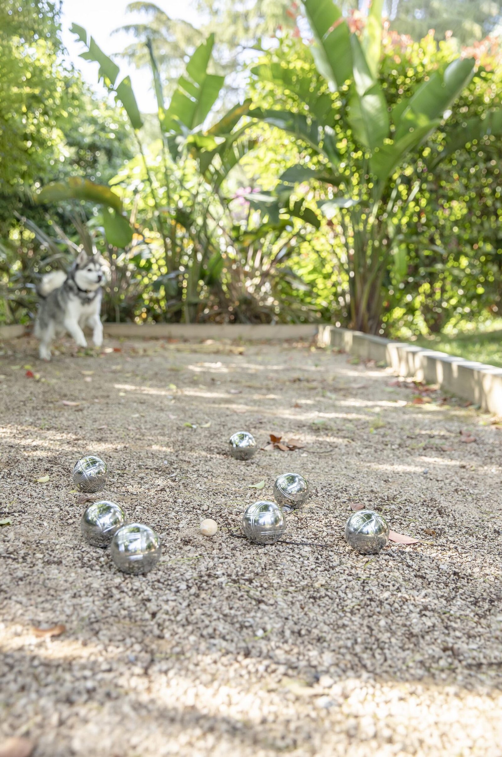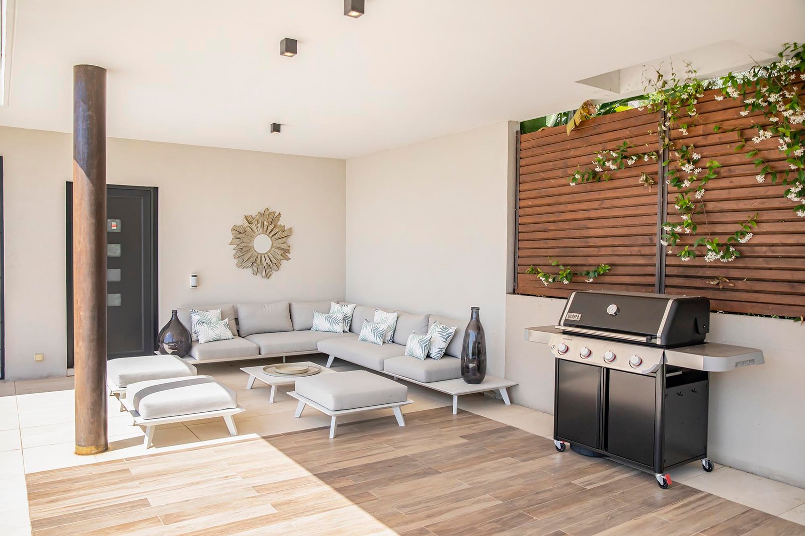 The villa boasts a range of additional amenities, including a vast, illuminated exotic garden, a heated infinity pool, and a petanque court. Parking is convenient with a covered area for two cars and additional exterior parking. The property is also equipped with an advanced home automation system.