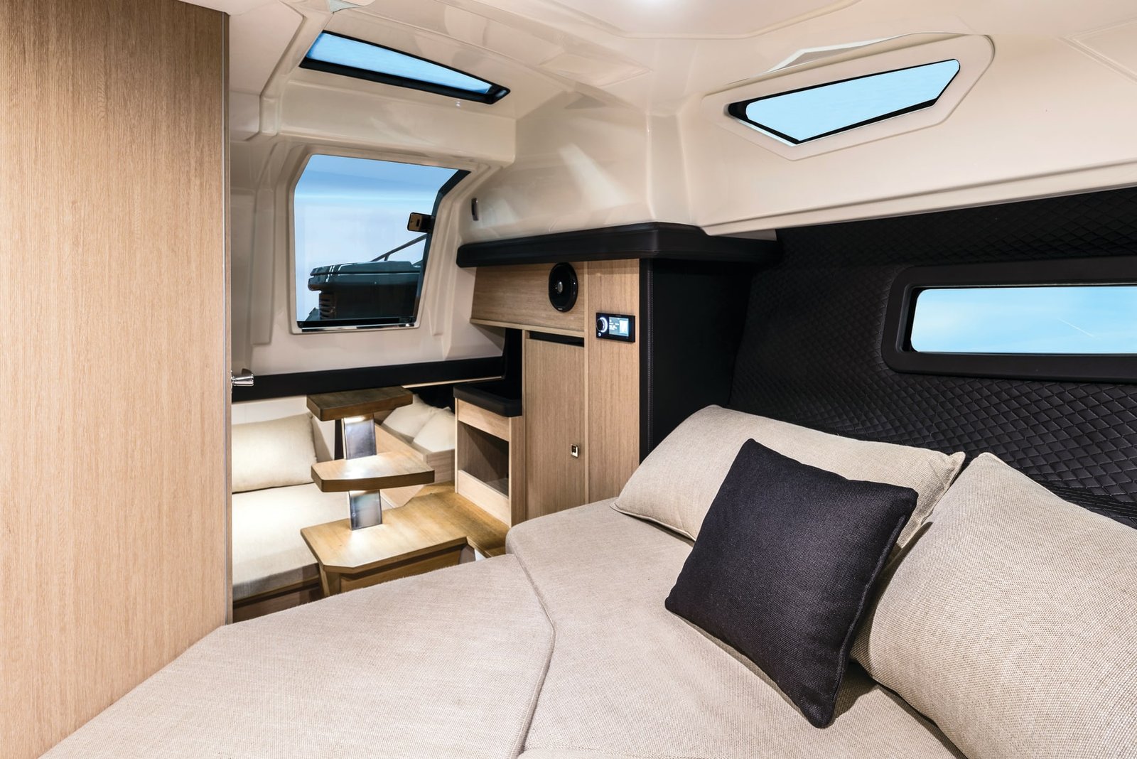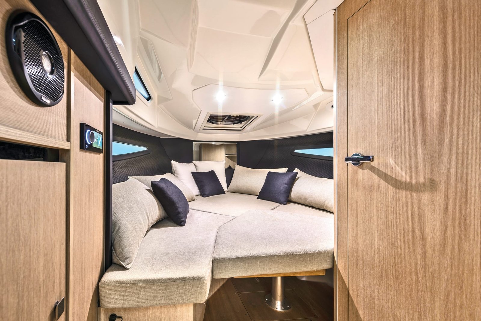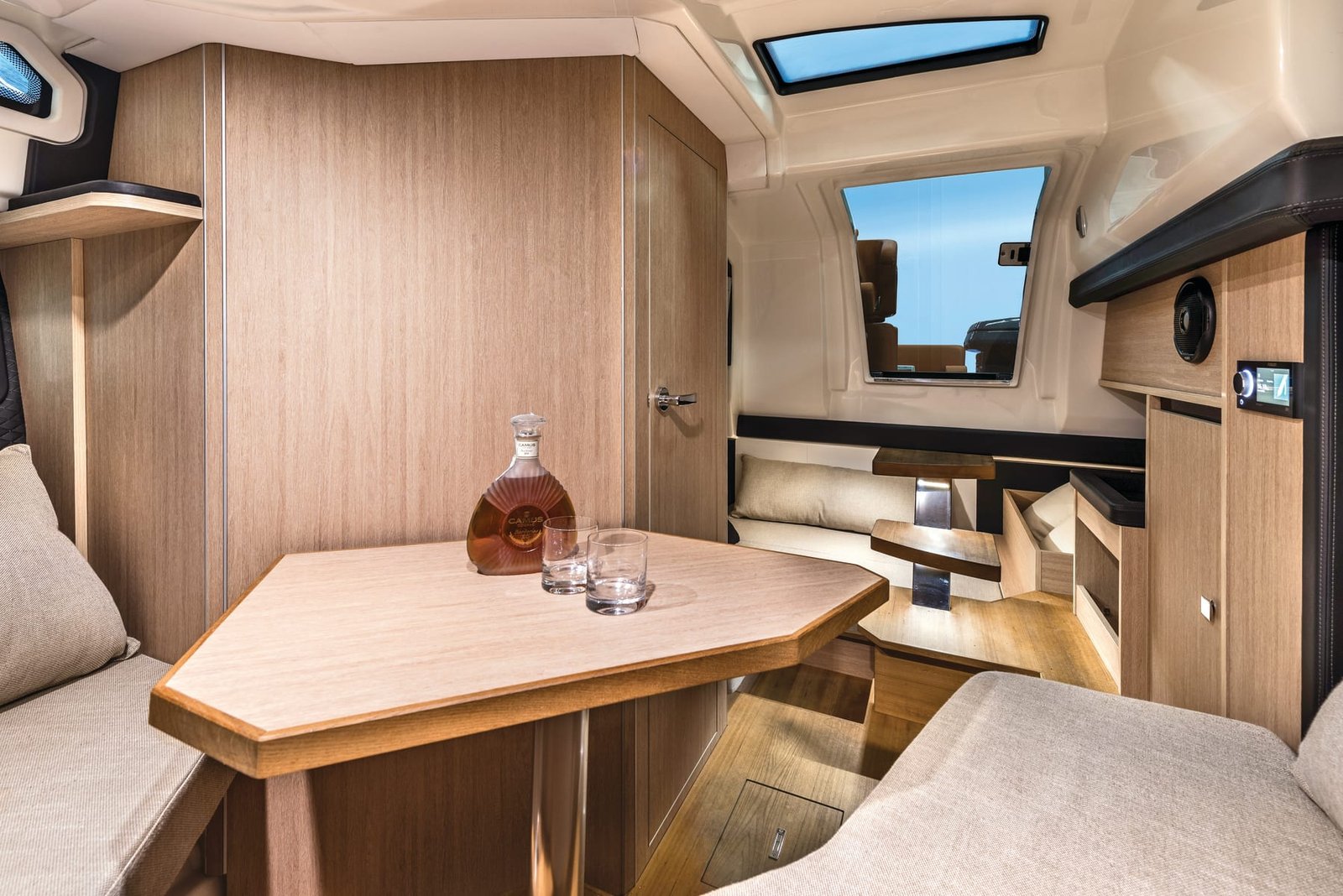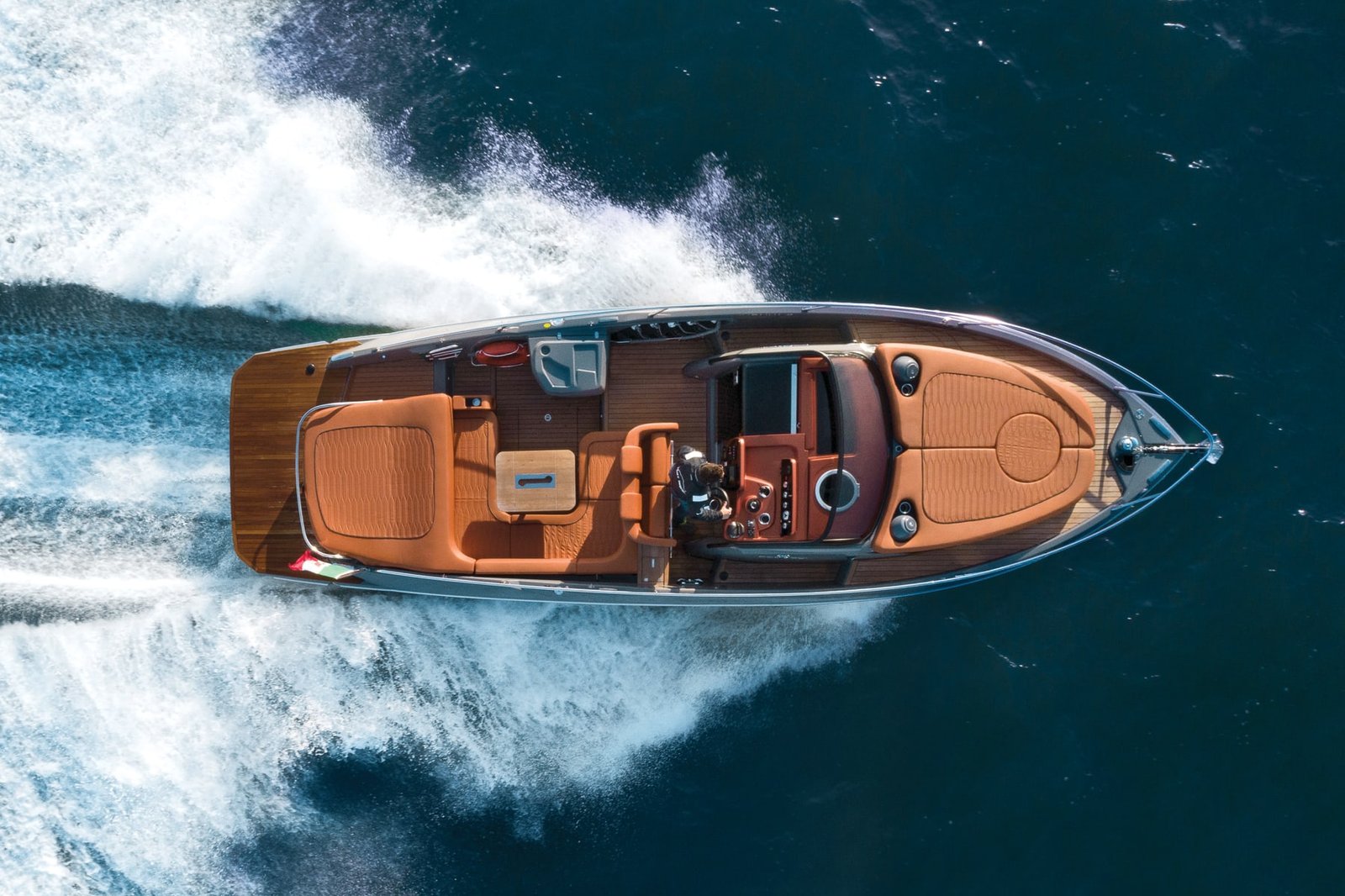 The 9.85 metre daycruiser features soft lines and refined details with a sporty, vintage style which enhance it in terms of functionality and elegance.