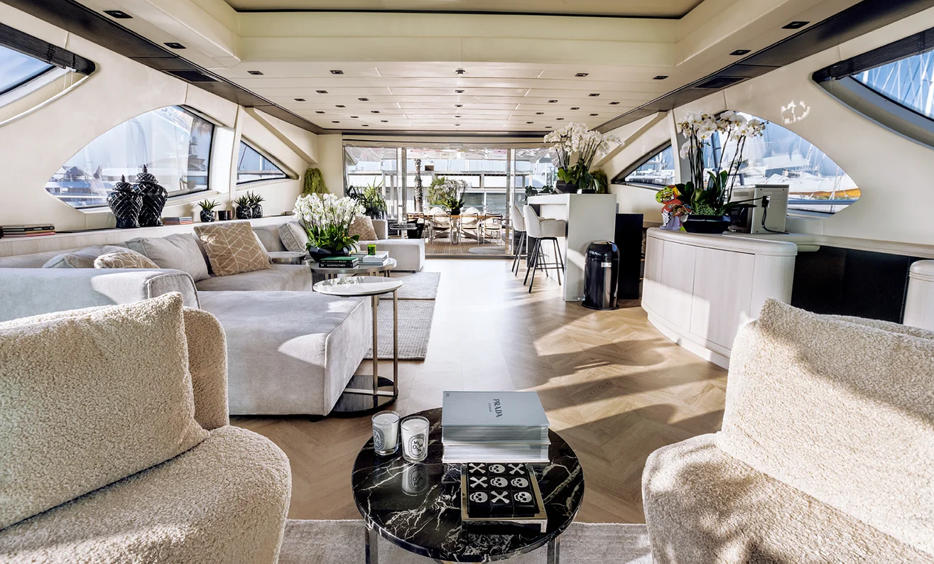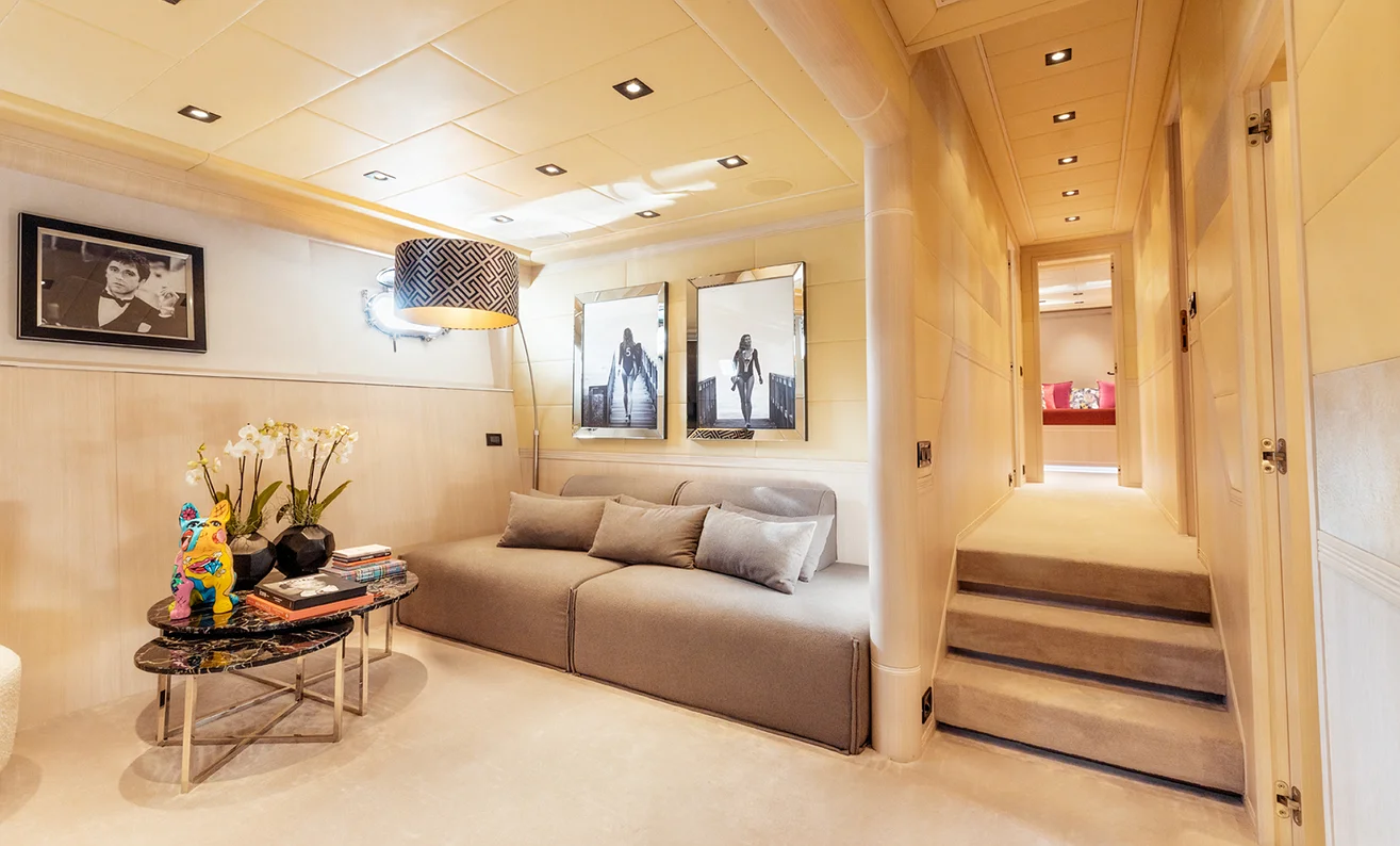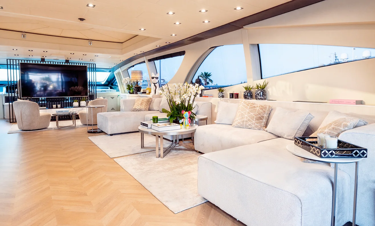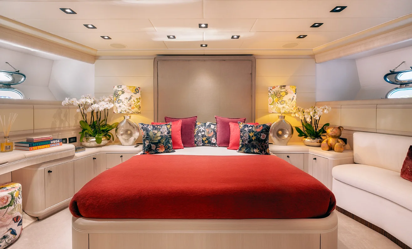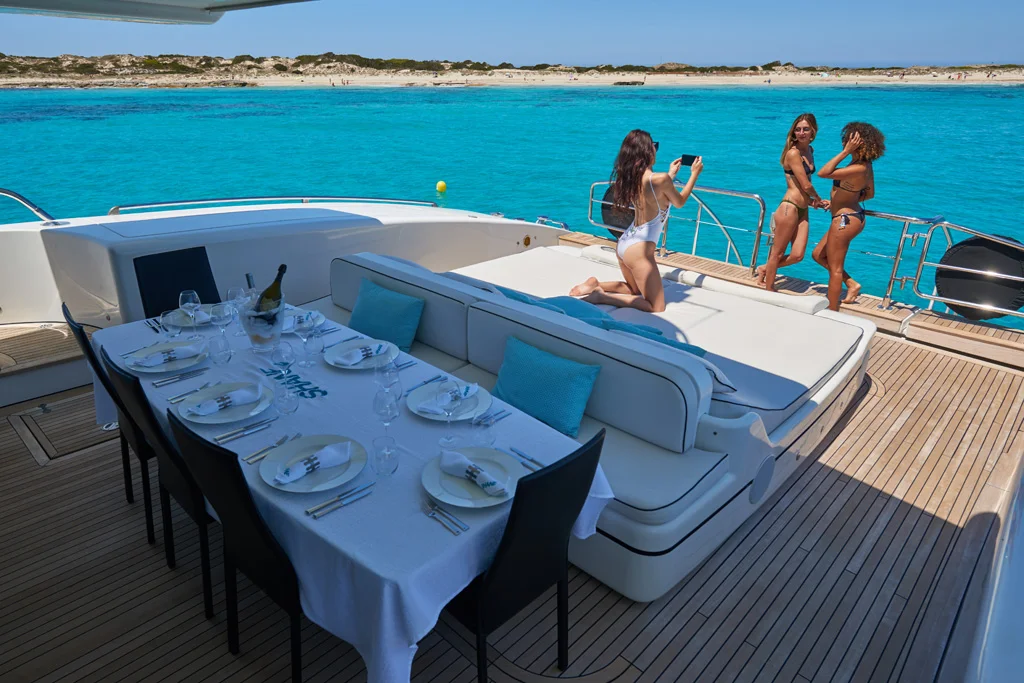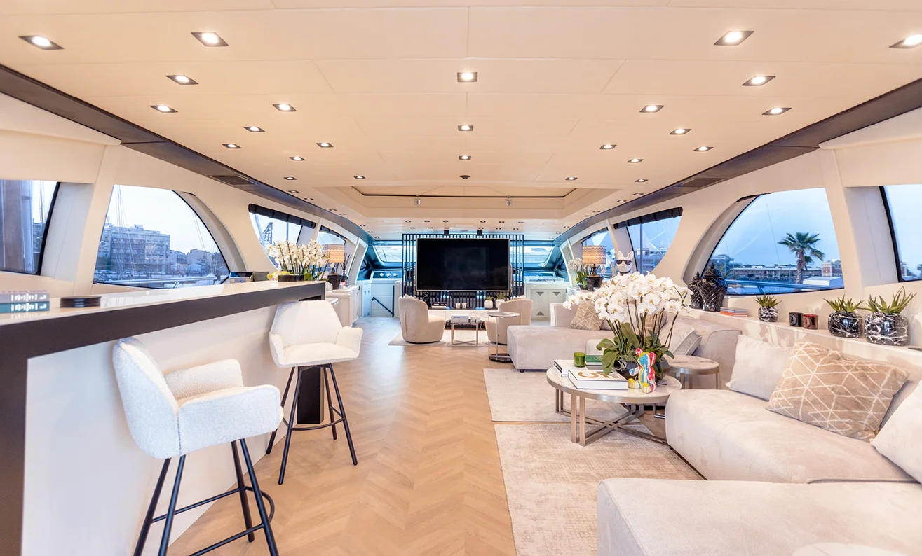 Her striking profile is matched by spacious outdoor areas, including expansive sunpads forward and aft, perfect for soaking up the sun, socializing, or enjoying panoramic sea views while cruising at exhilarating speeds of up to 35 knots. The aft deck transforms into an alfresco dining and lounging space, leading seamlessly down to a generous swim platform that provides effortless access to the sea and water toys.