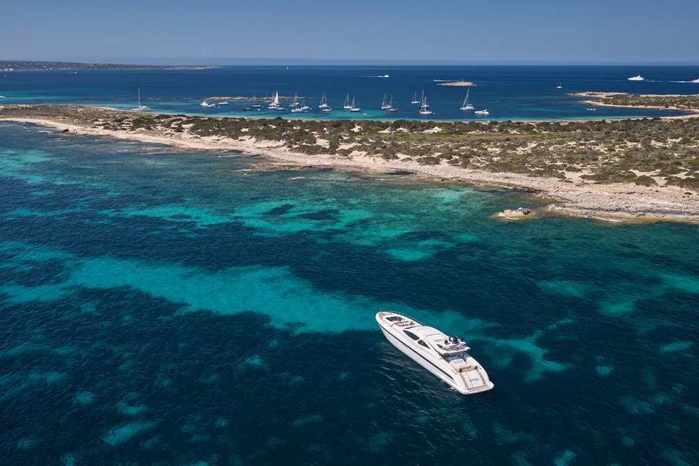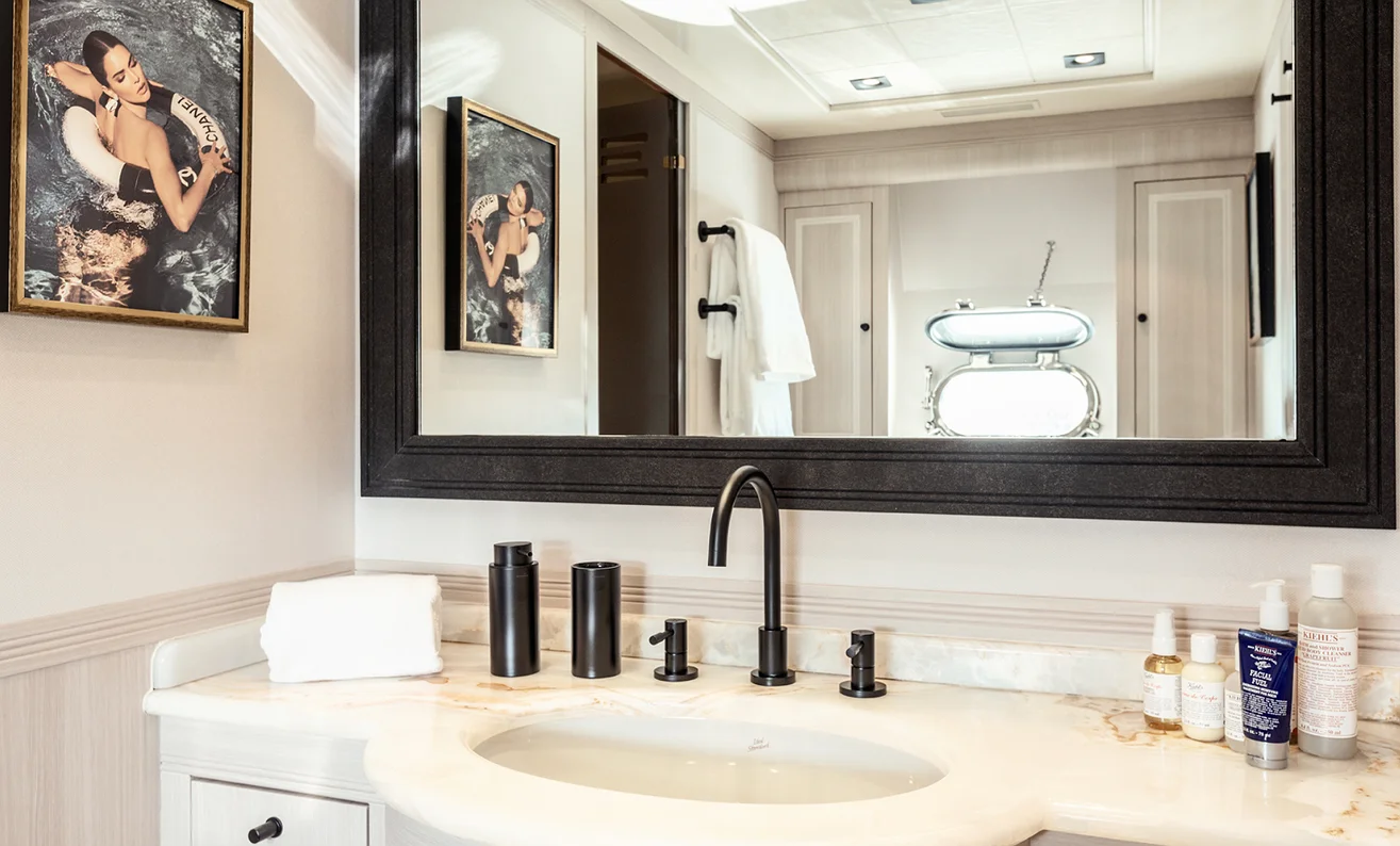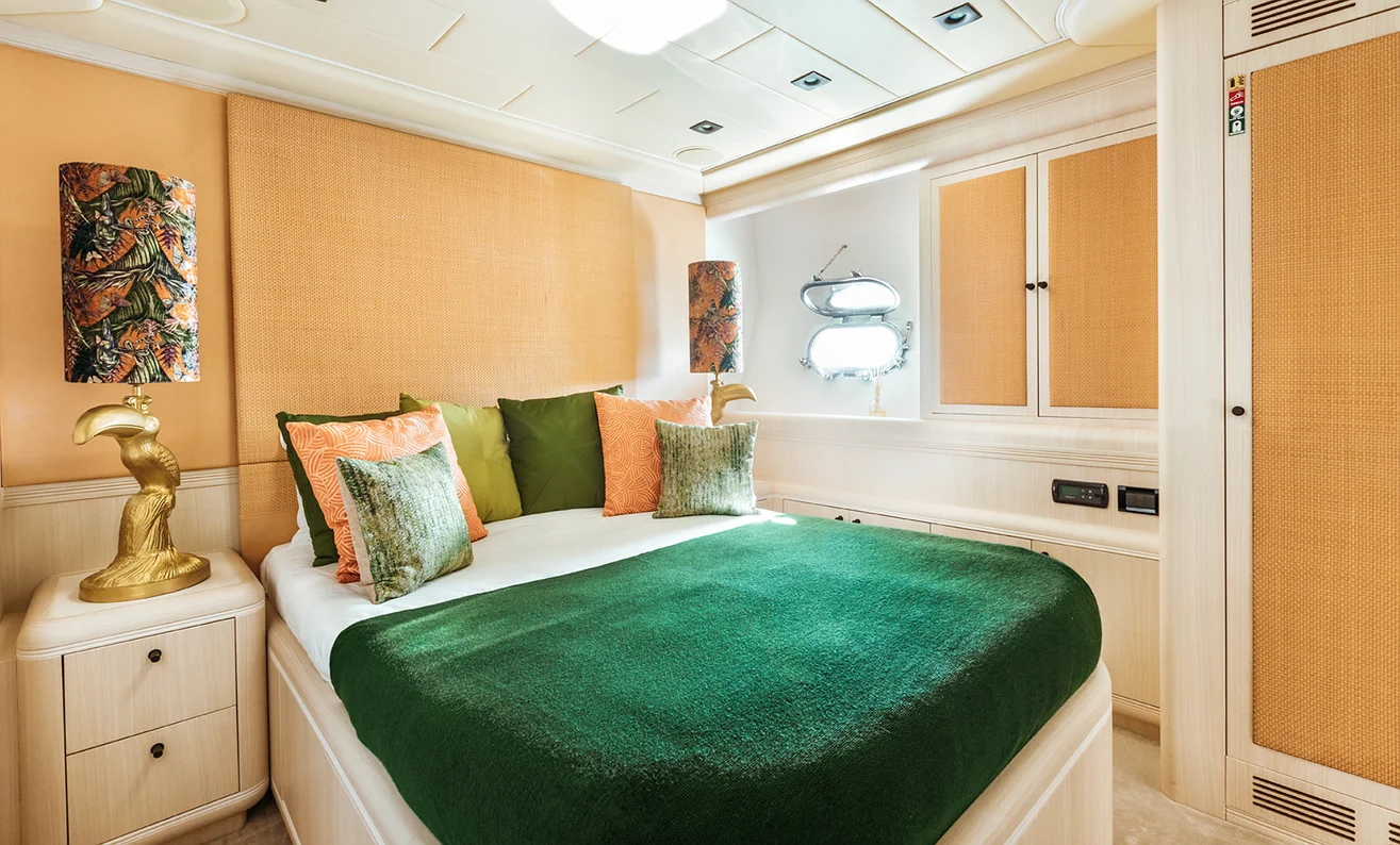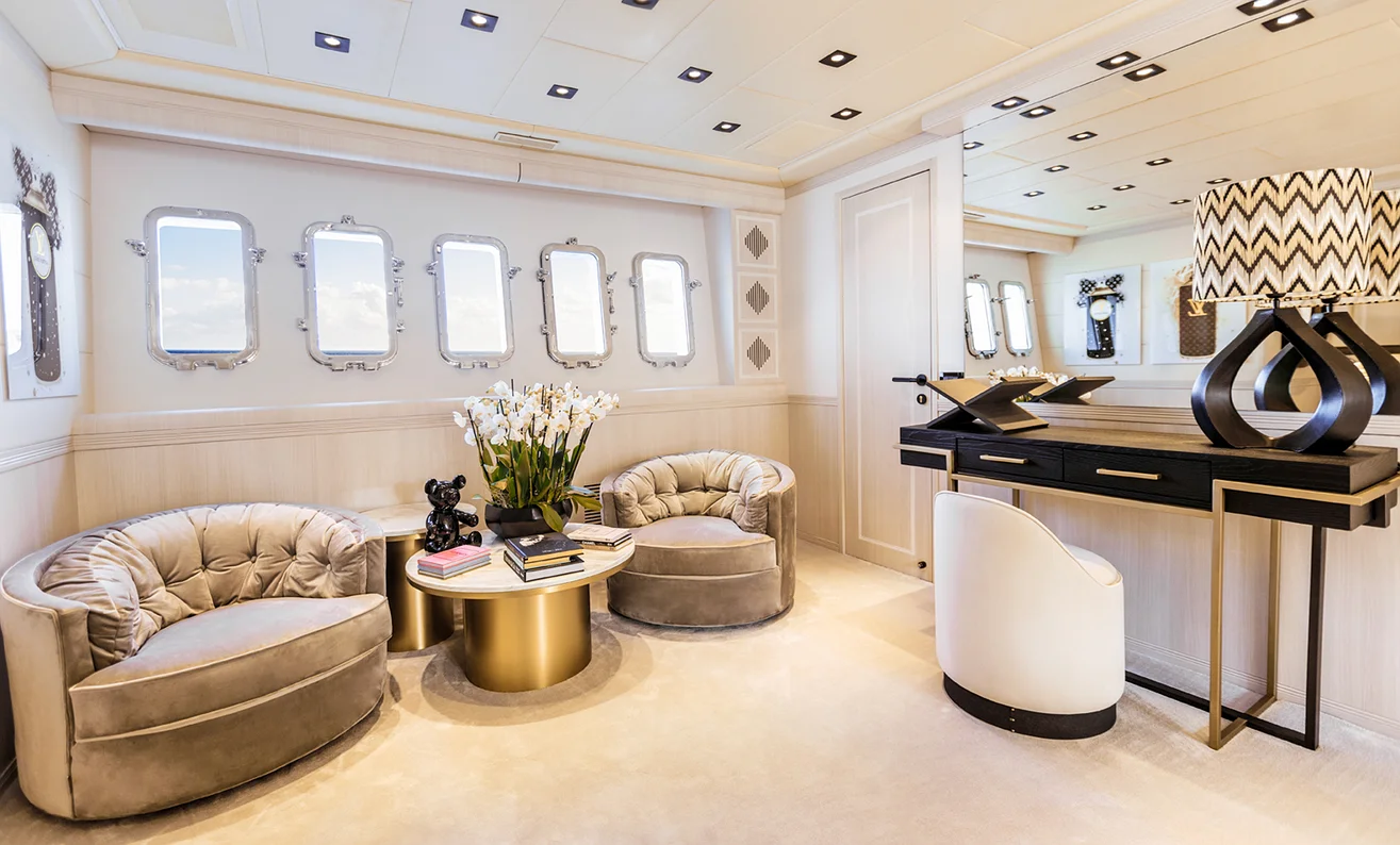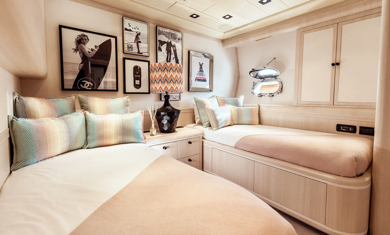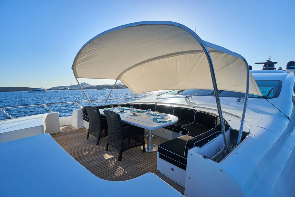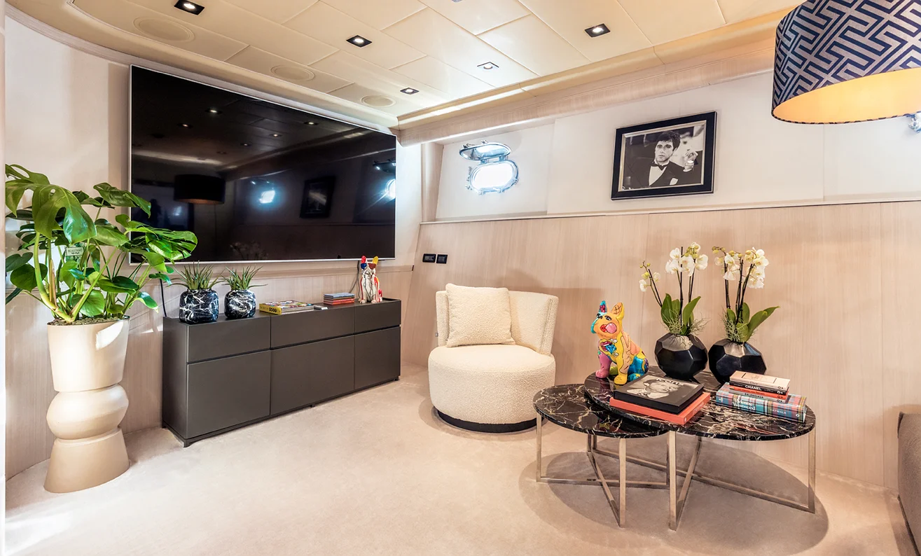 Her striking profile is matched by spacious outdoor areas, including expansive sunpads forward and aft, perfect for soaking up the sun, socializing, or enjoying panoramic sea views while cruising at exhilarating speeds of up to 35 knots. The aft deck transforms into an alfresco dining and lounging space, leading seamlessly down to a generous swim platform that provides effortless access to the sea and water toys.