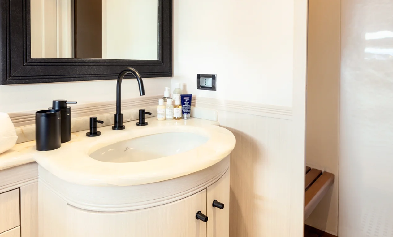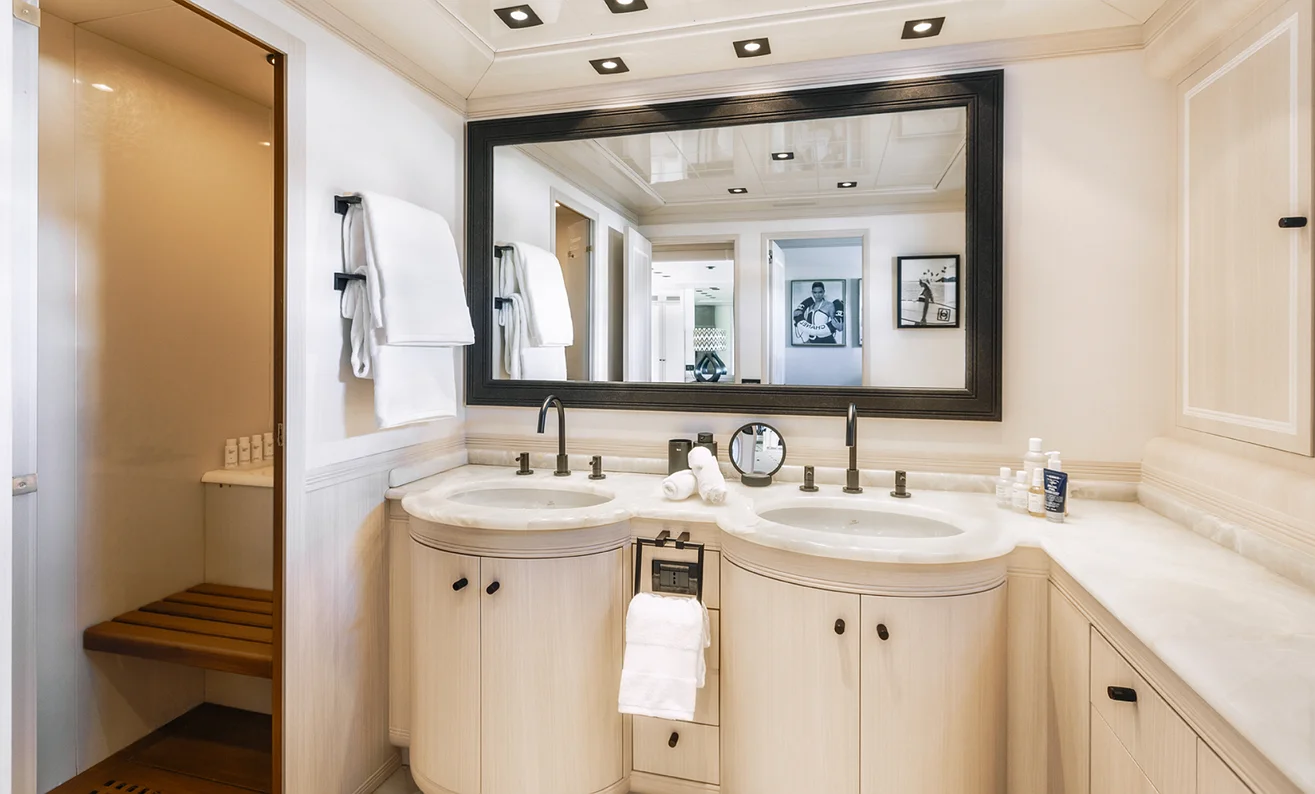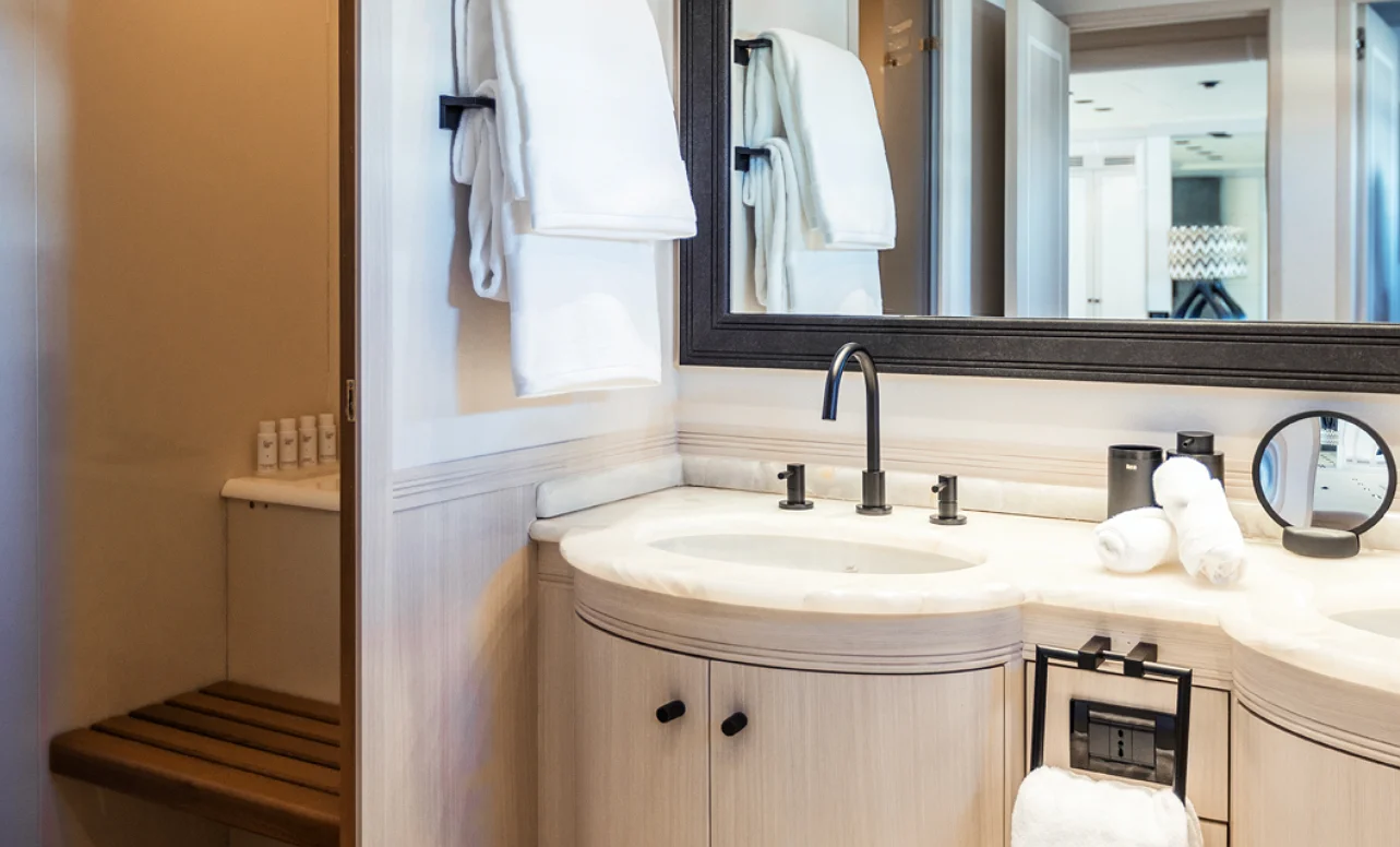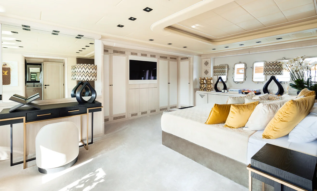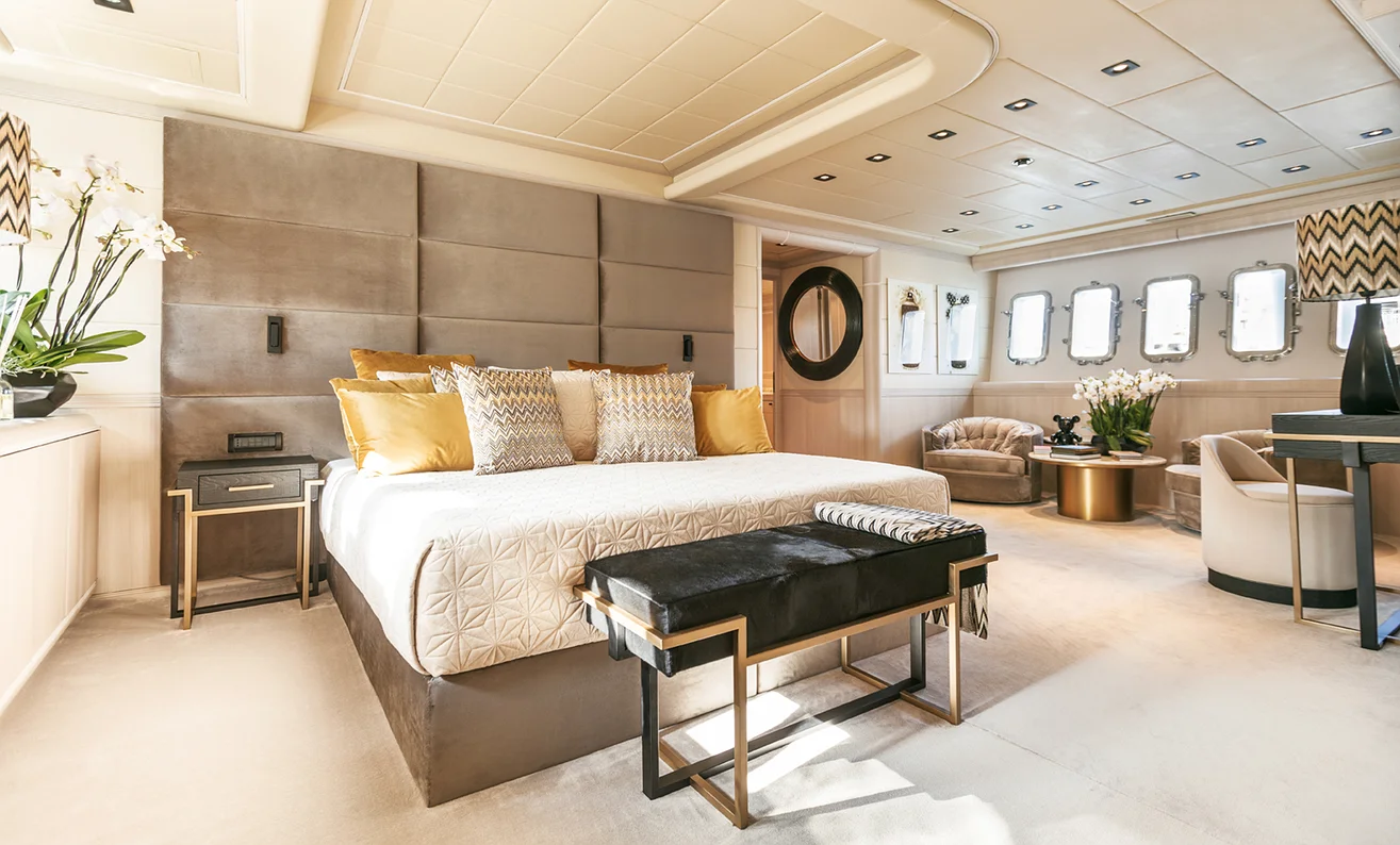 Inside, the Mangusta 130 offers a refined interior with contemporary furnishings, a light-filled salon, and wide windows that blur the line between indoors and out. The yacht accommodates up to 10 guests across five elegant staterooms, including a full-beam master suite that exudes comfort and privacy.