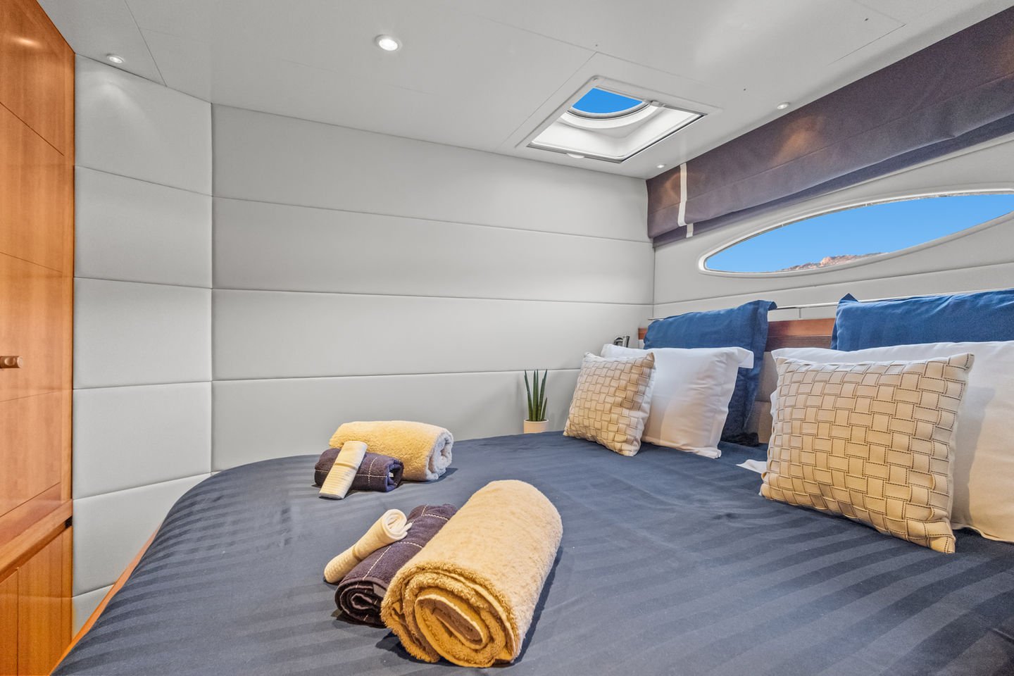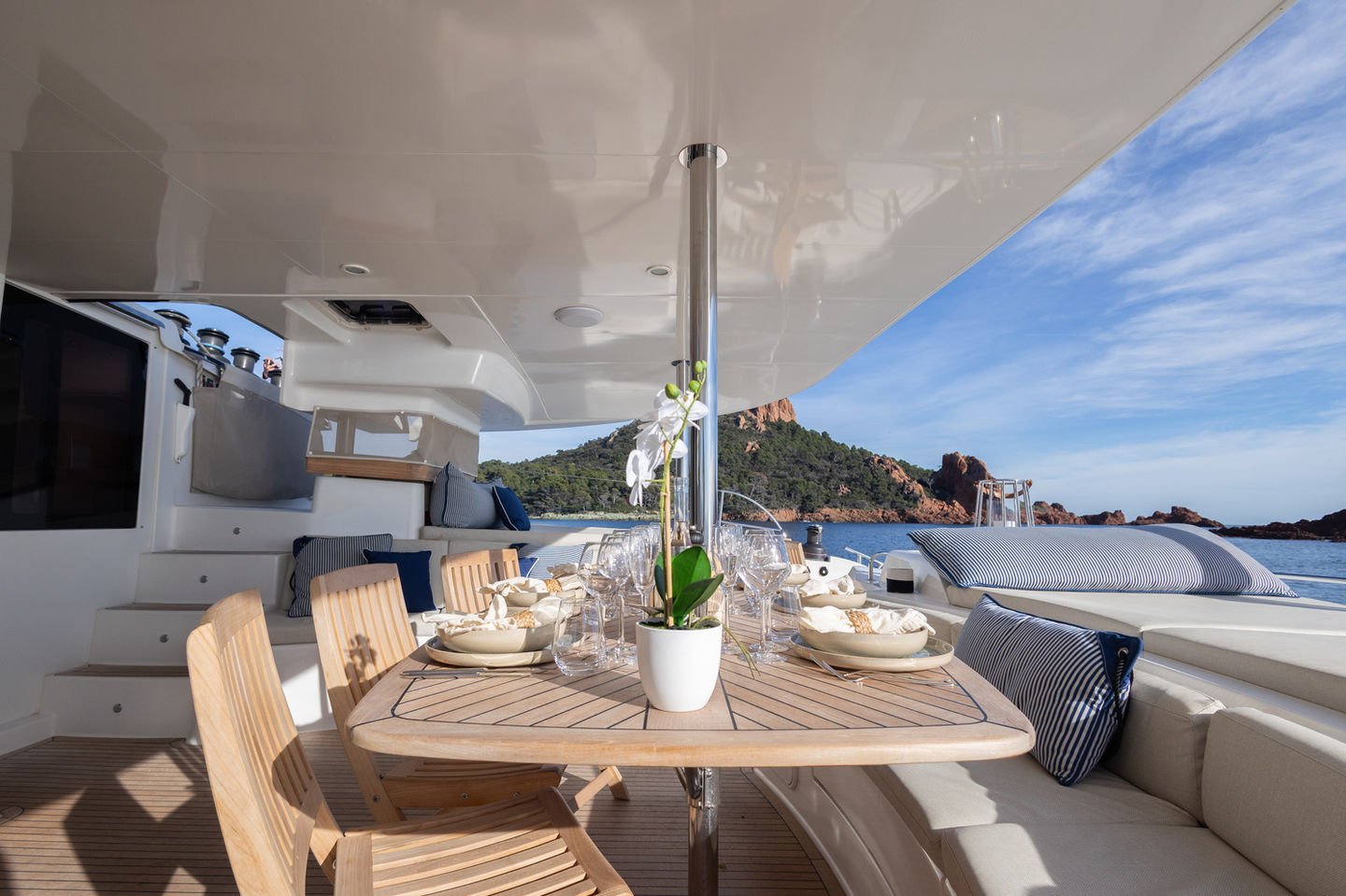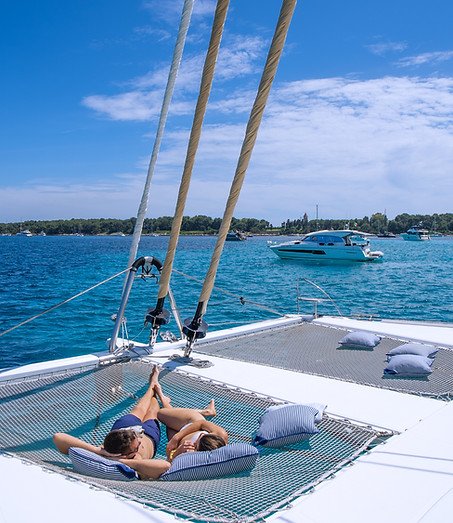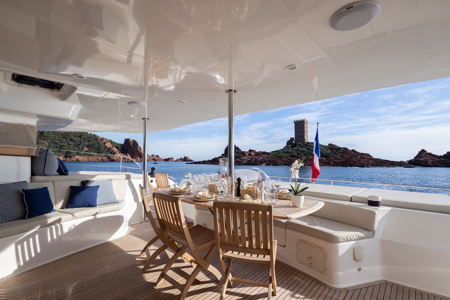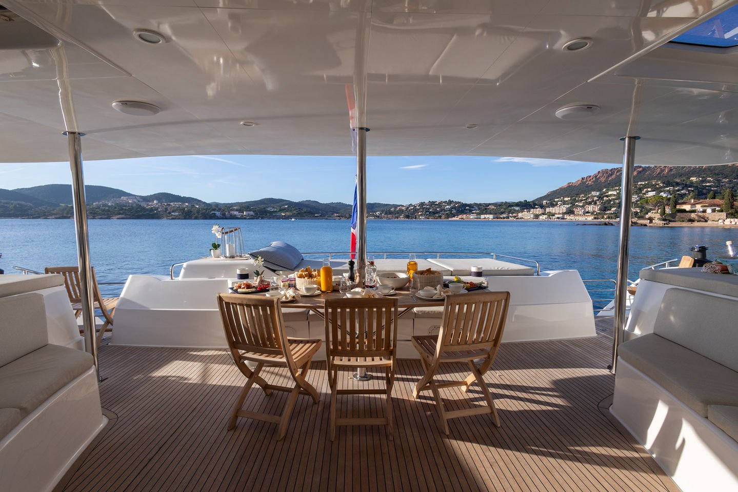 Your floating villa welcomes you for unforgettable cruises on the Mediterranean. With expansive outdoor spaces to enjoy the sun and sea, and an elegant interior lounge for relaxation, every moment on board is designed for your comfort. Three outdoor lounges, a fully equipped kitchen, cozy cabins, and even nets suspended above the water create a unique experience that blends relaxation and conviviality. At the aft, a true private beach invites you to savor an aperitif by the water or dive straight into nautical activities. An ideal setting to experience the sea as if you were at home, yet with all the charm and freedom of the open water.