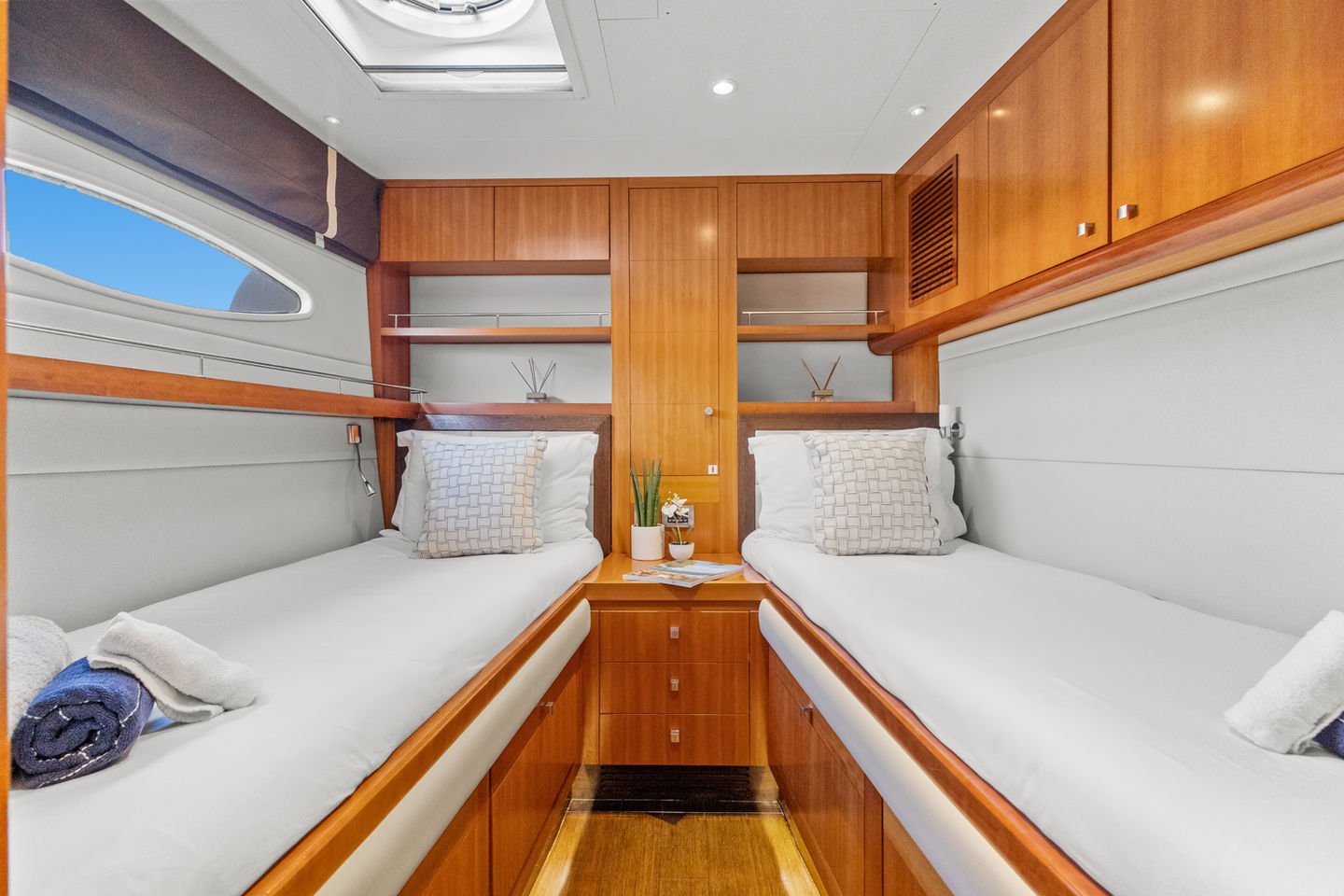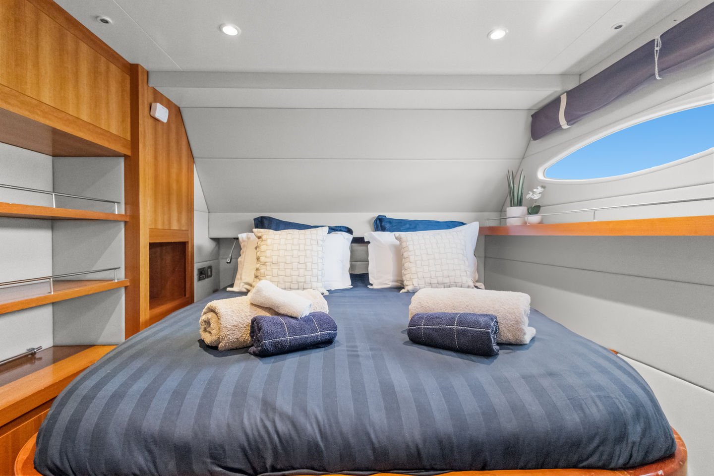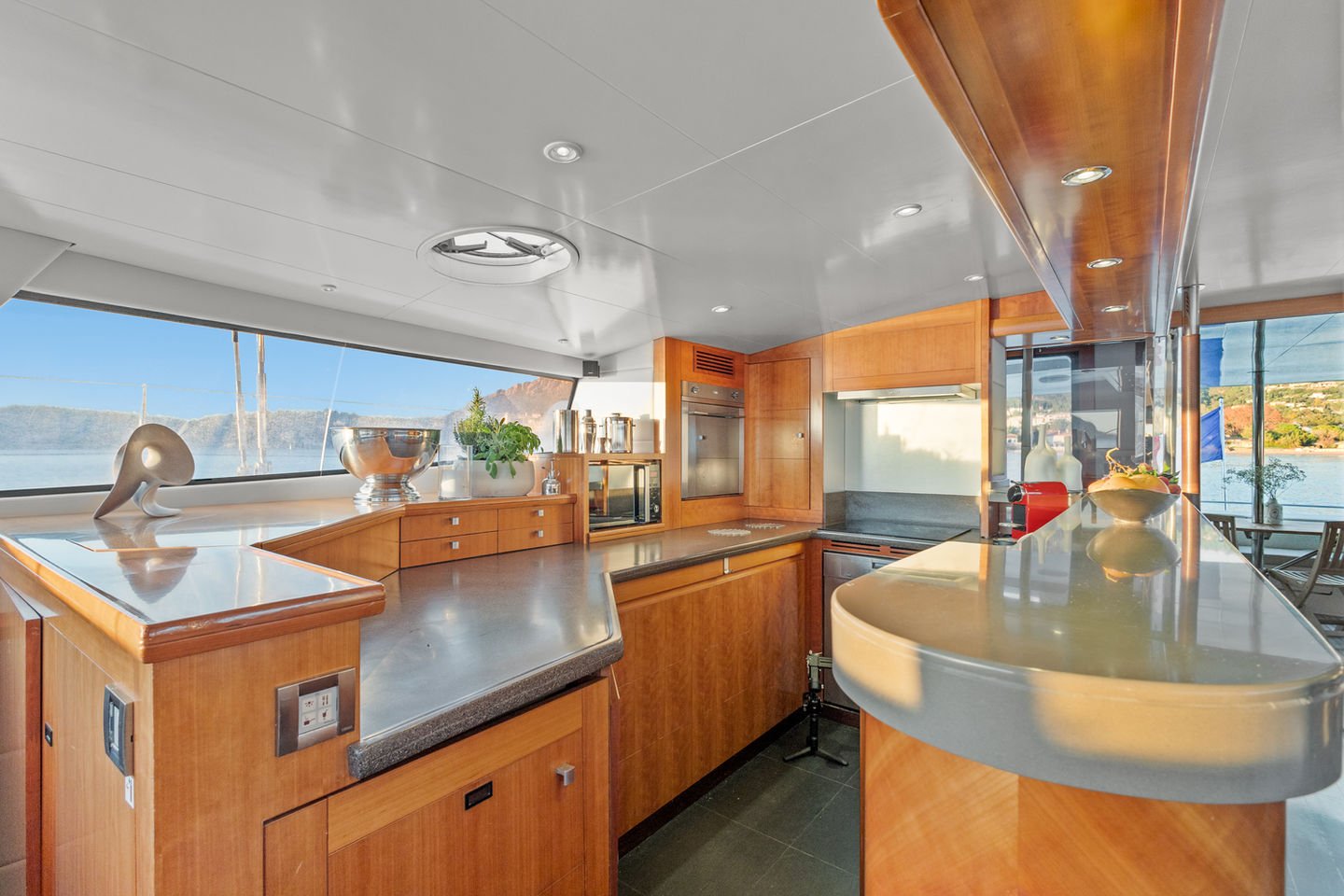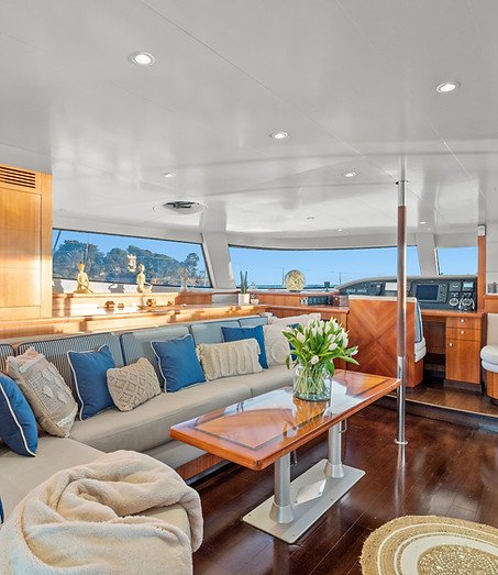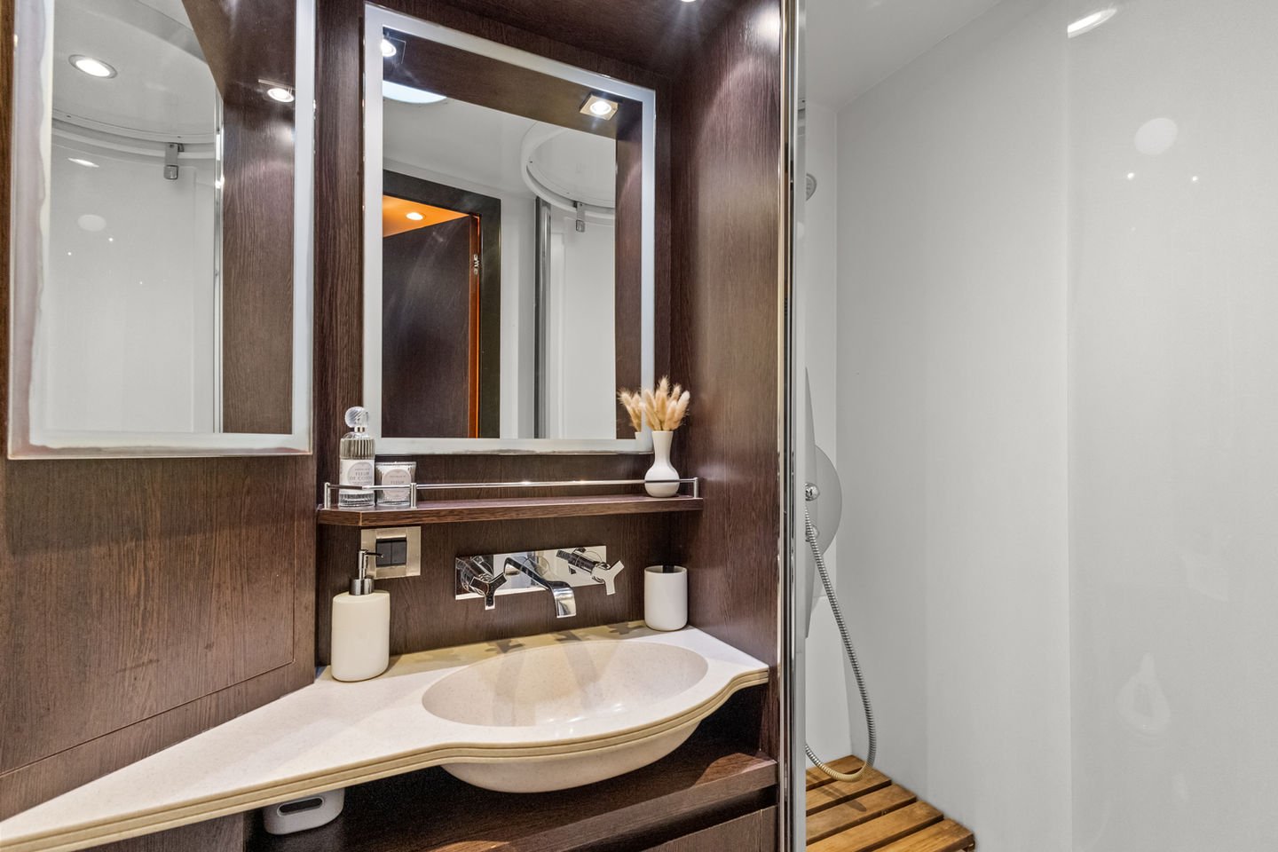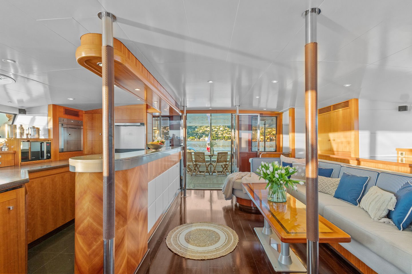 Your floating villa welcomes you for unforgettable cruises on the Mediterranean. With expansive outdoor spaces to enjoy the sun and sea, and an elegant interior lounge for relaxation, every moment on board is designed for your comfort. Three outdoor lounges, a fully equipped kitchen, cozy cabins, and even nets suspended above the water create a unique experience that blends relaxation and conviviality. At the aft, a true private beach invites you to savor an aperitif by the water or dive straight into nautical activities. An ideal setting to experience the sea as if you were at home, yet with all the charm and freedom of the open water.