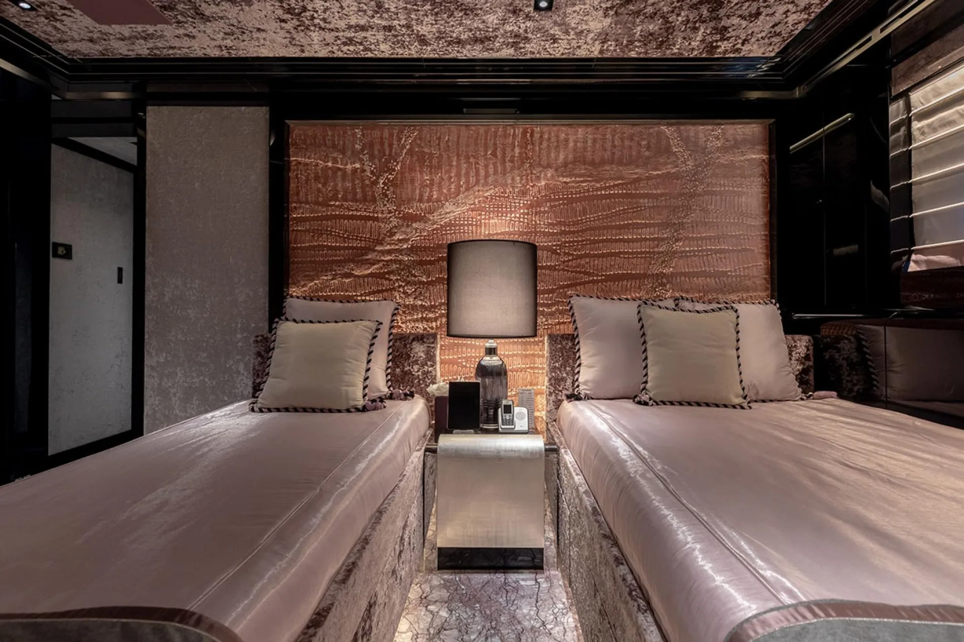 Accommodating up to 12 guests in six luxurious cabins, each uniquely designed with custom textiles and semi-precious stones, the yacht ensures unparalleled comfort.