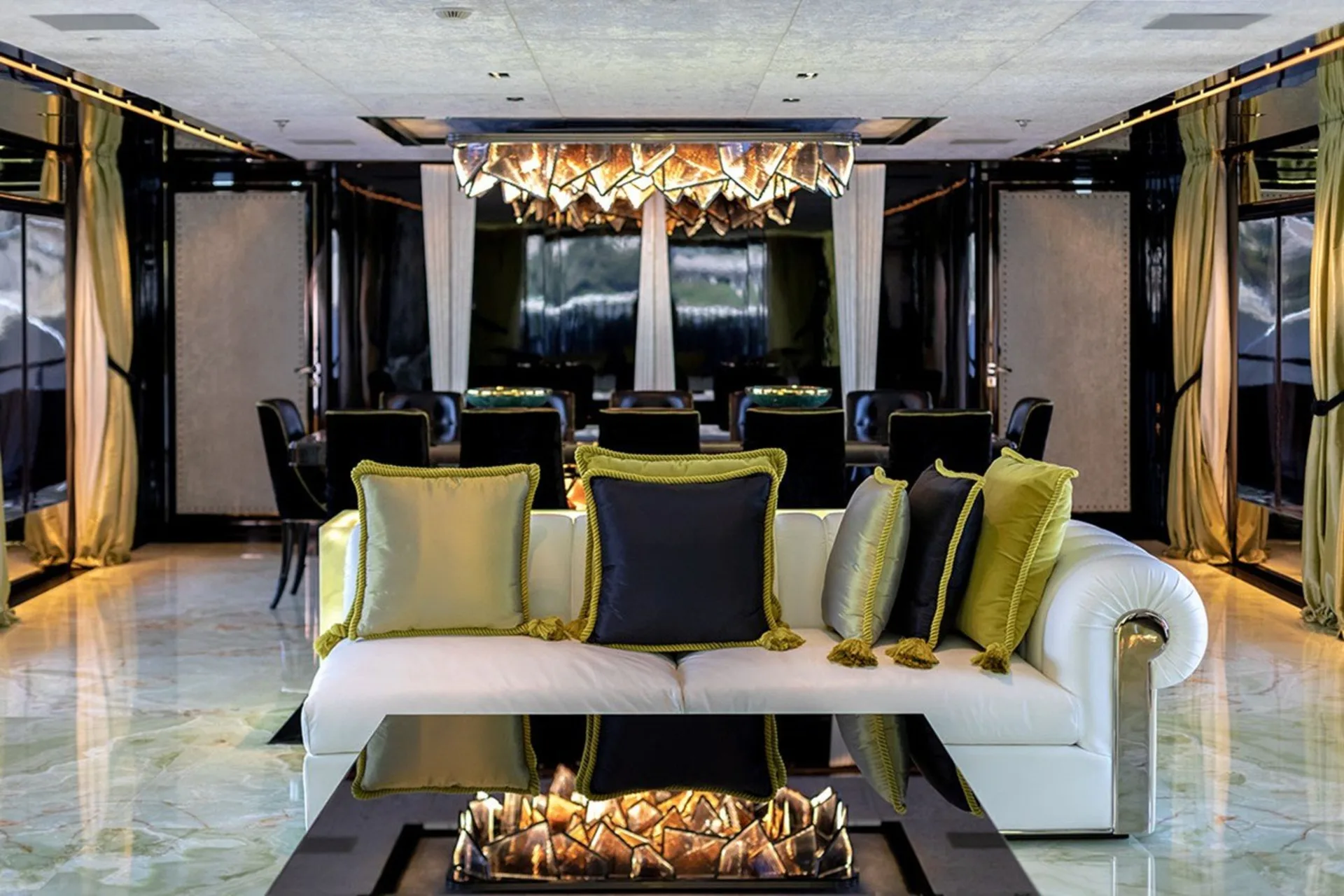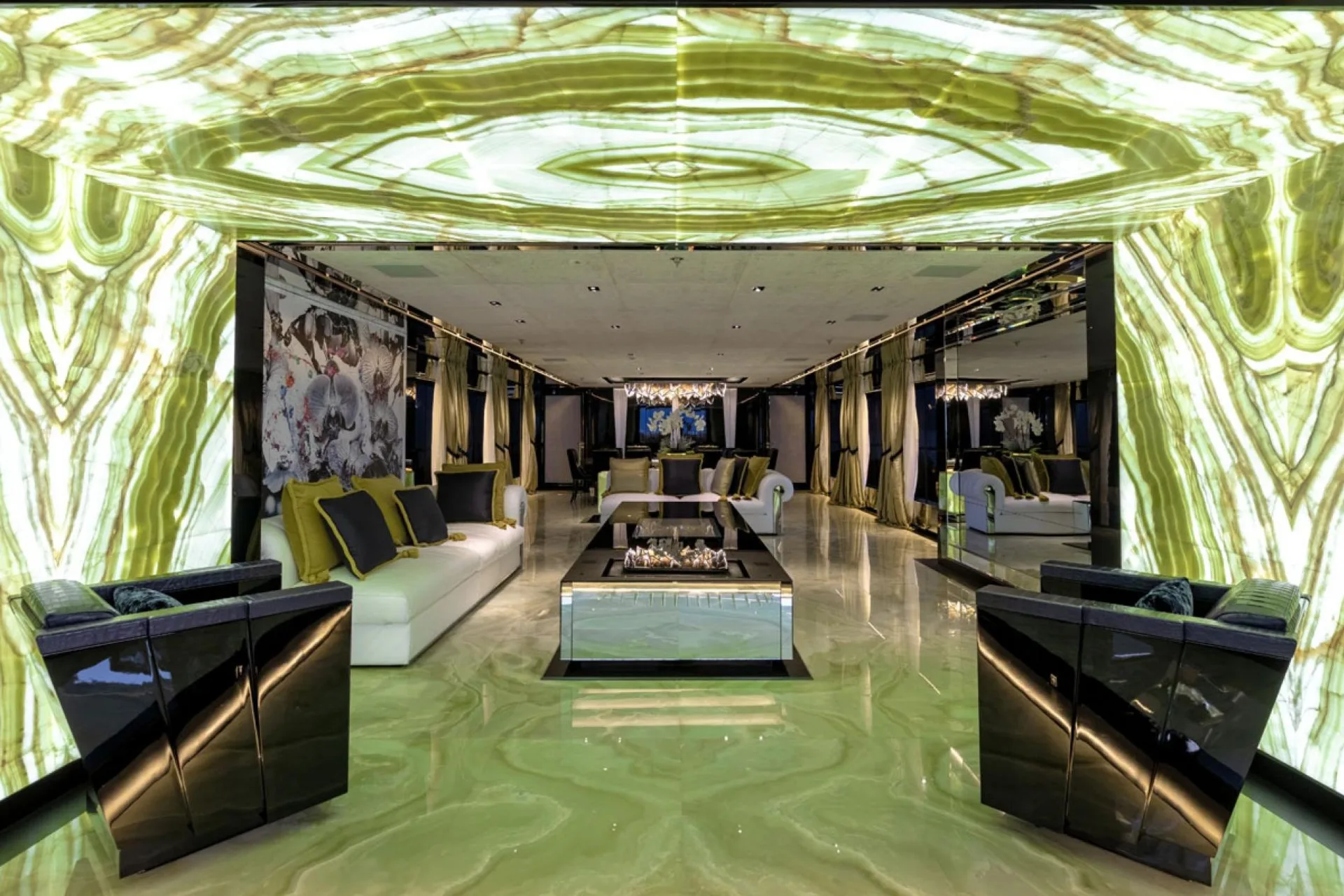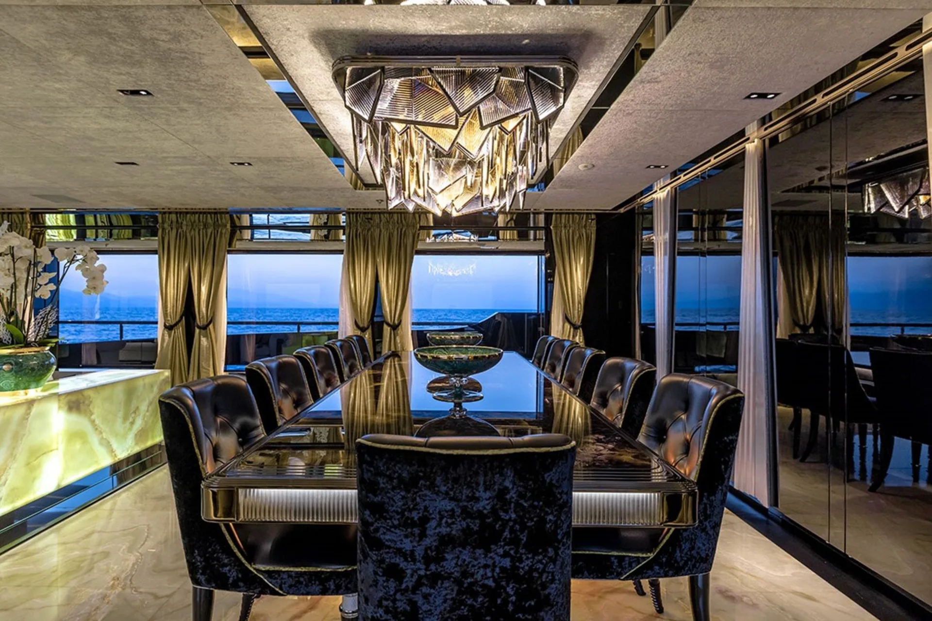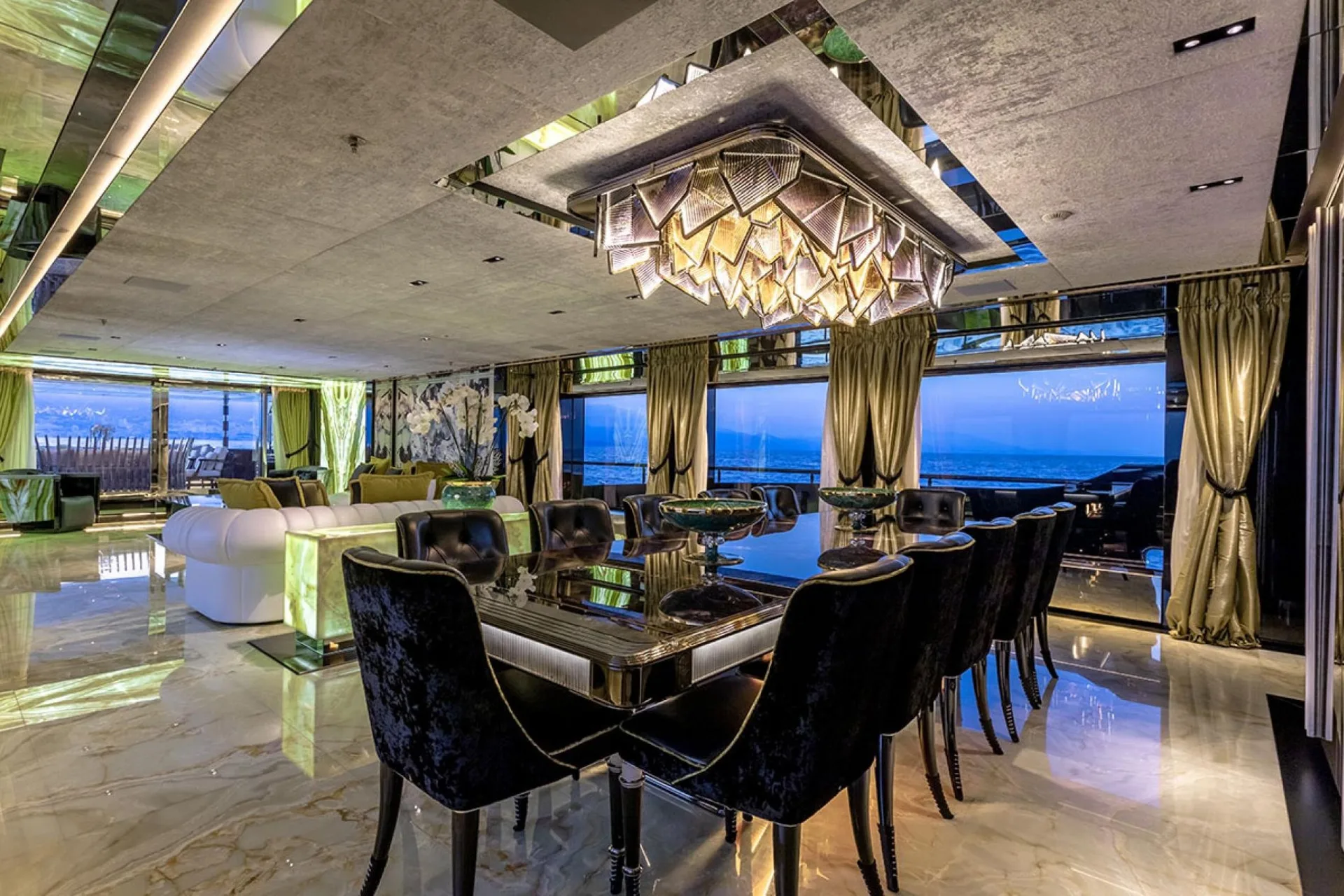 Designed for perfection, the yacht features lavish materials throughout. The main salon, equipped with back-lit onyx and a state-of-the-art Kaleidescape entertainment system, showcases fine marble floors and artistic furnishings. A striking Baldi amber crystal chandelier hangs above the dining table, with an onyx island that transforms into a bar.