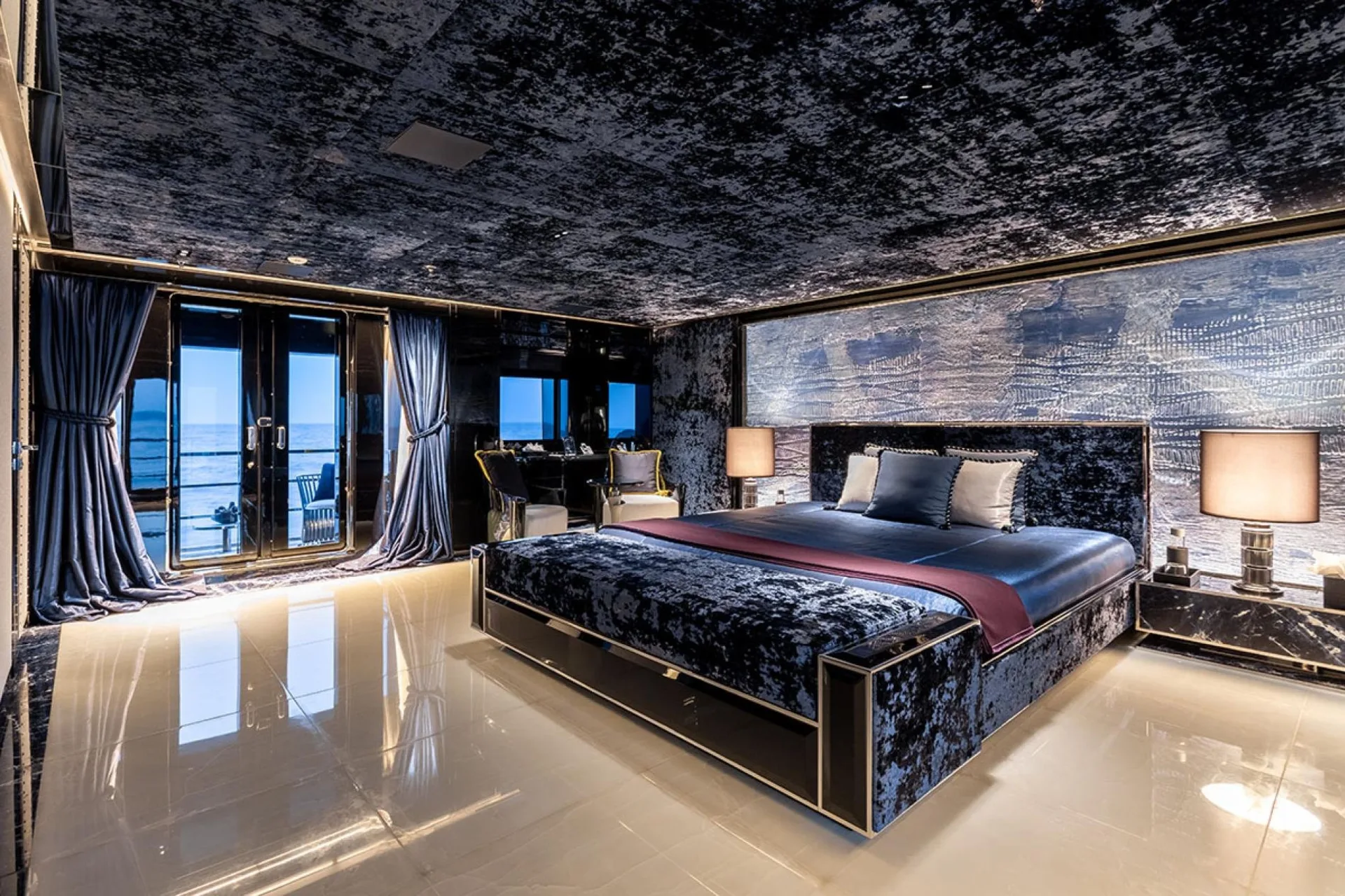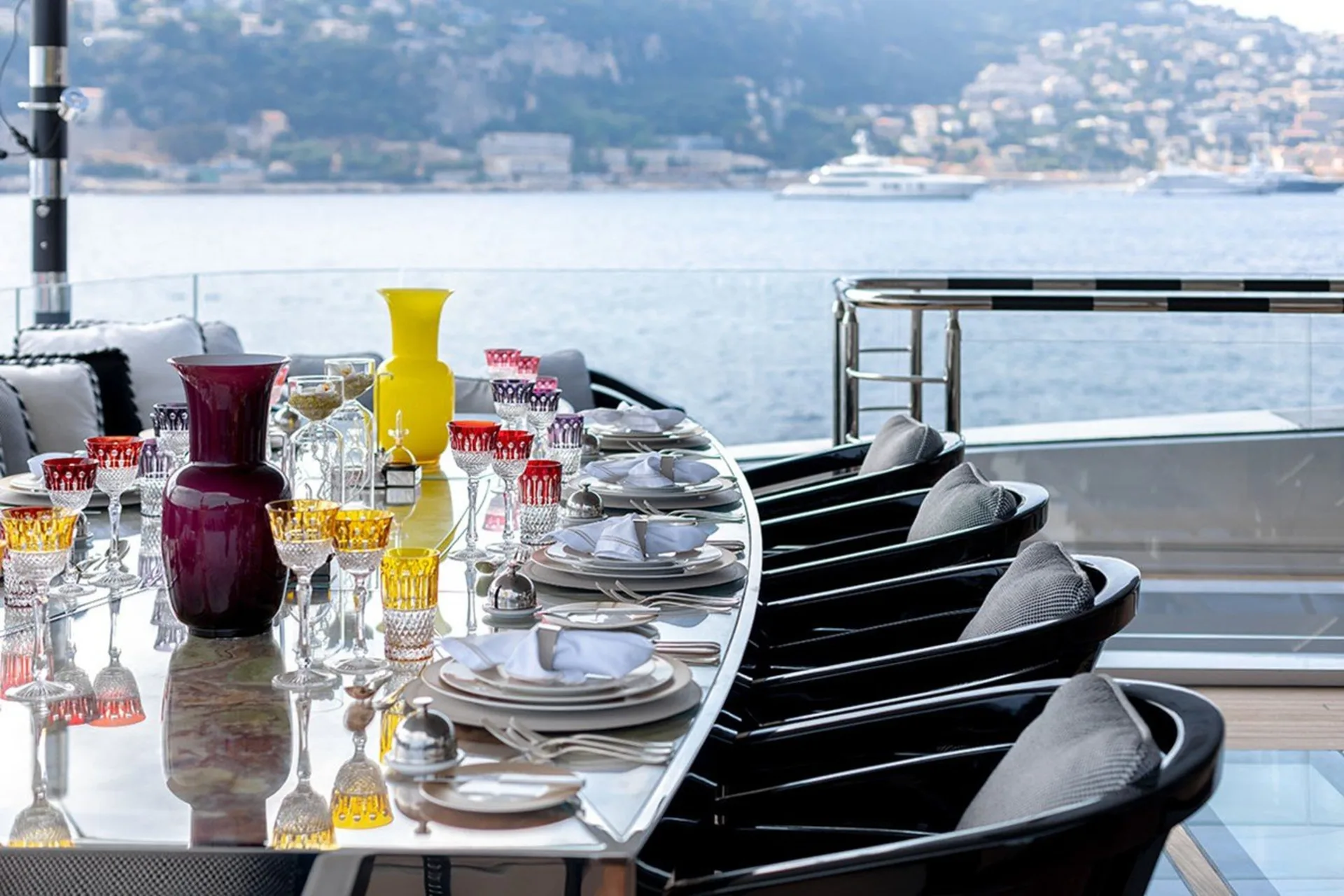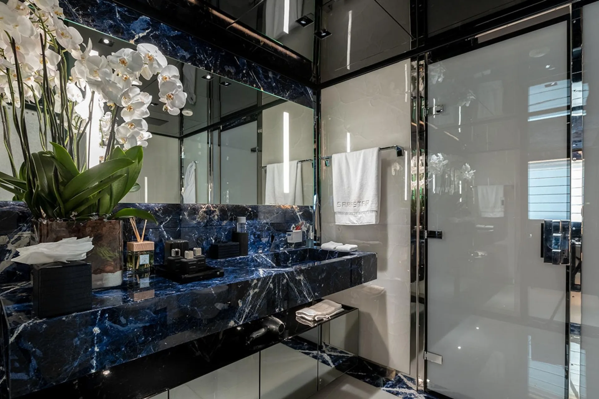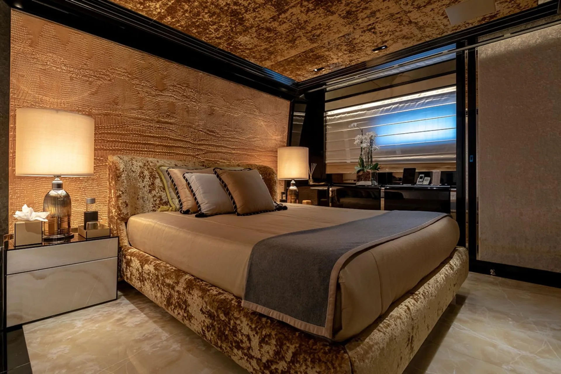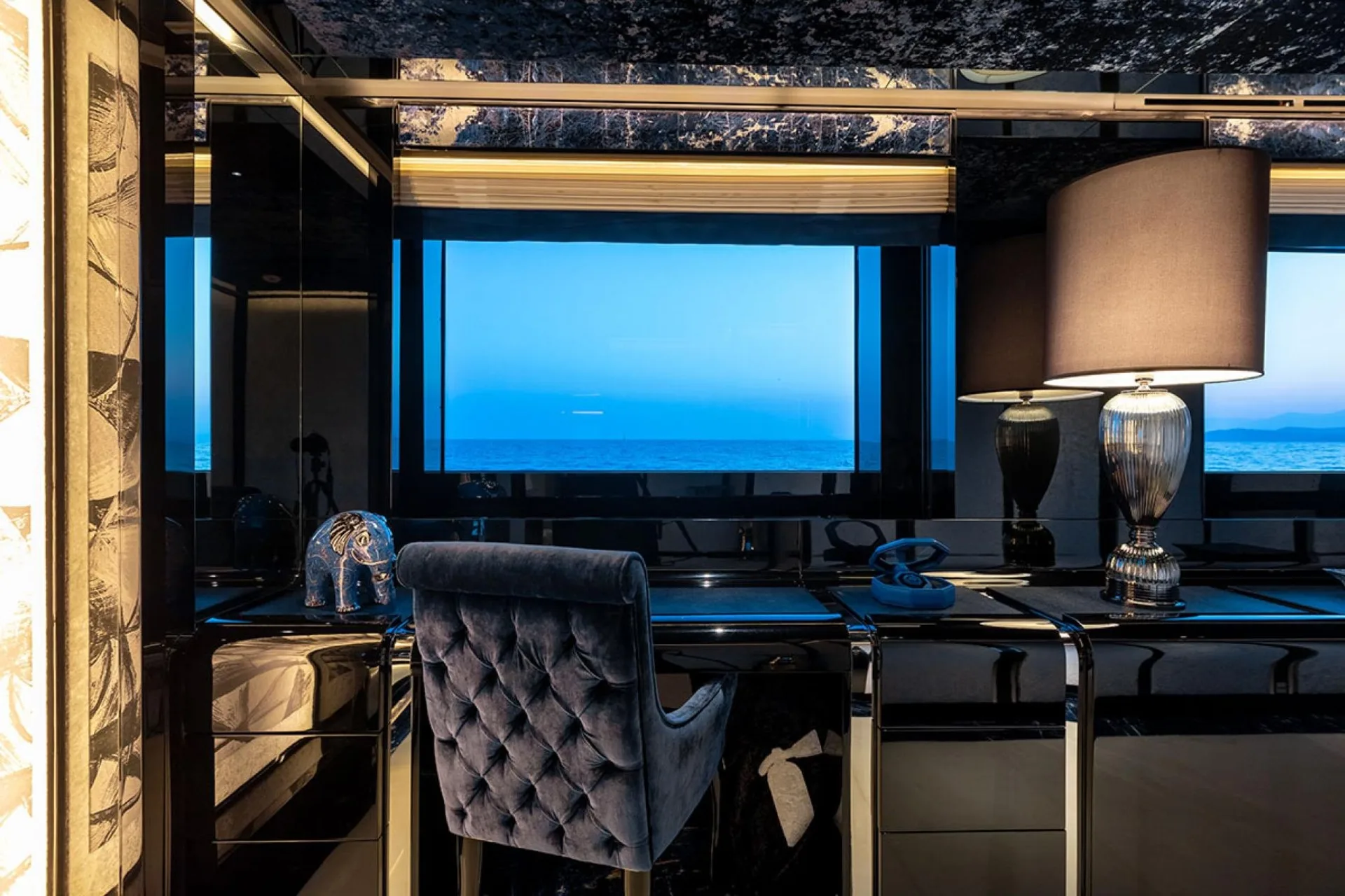 Designed for perfection, the yacht features lavish materials throughout. The main salon, equipped with back-lit onyx and a state-of-the-art Kaleidescape entertainment system, showcases fine marble floors and artistic furnishings. A striking Baldi amber crystal chandelier hangs above the dining table, with an onyx island that transforms into a bar.