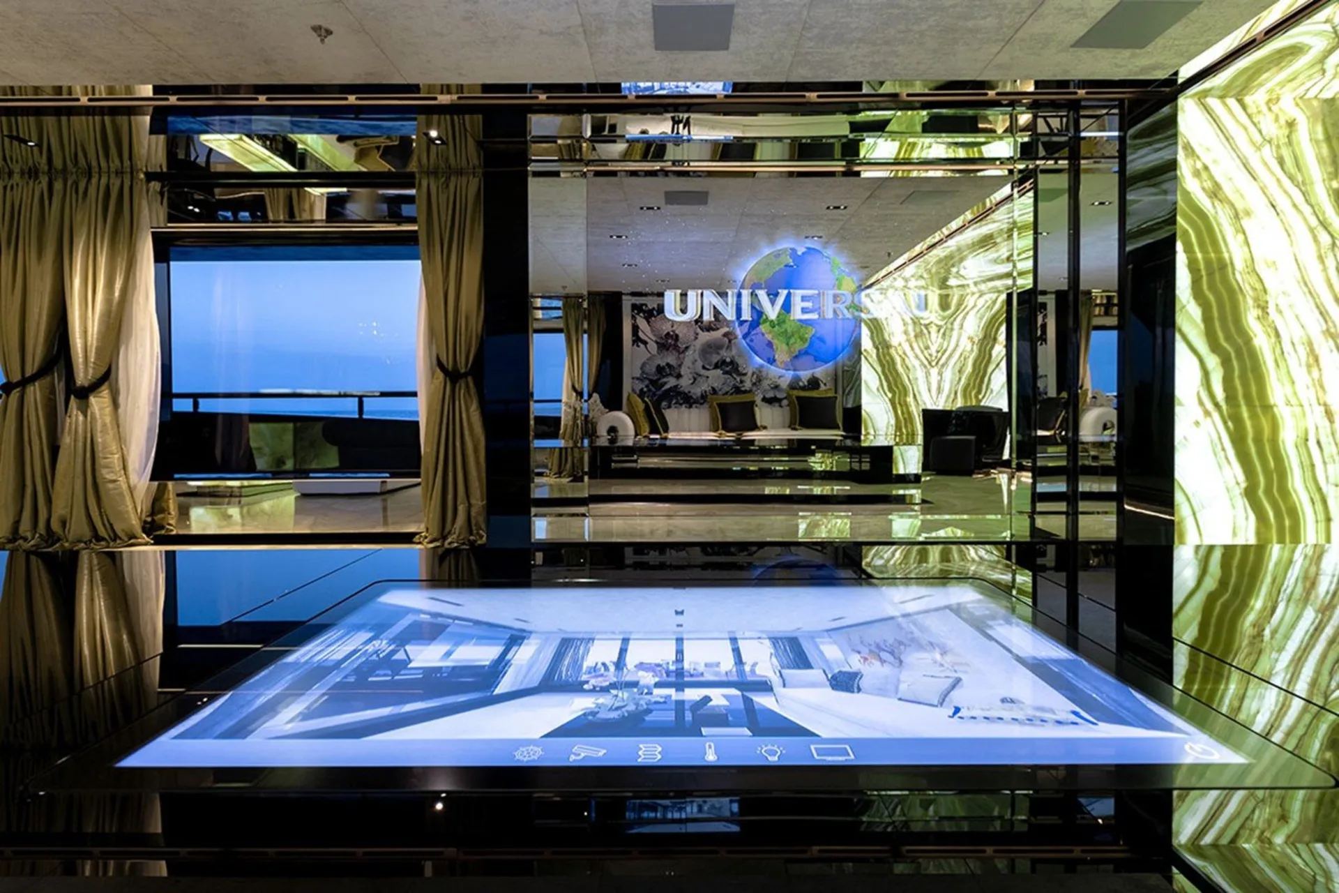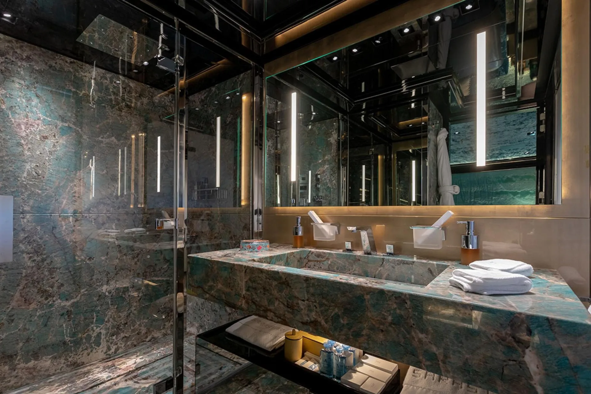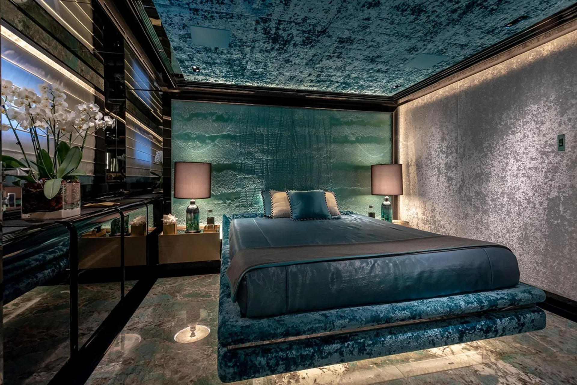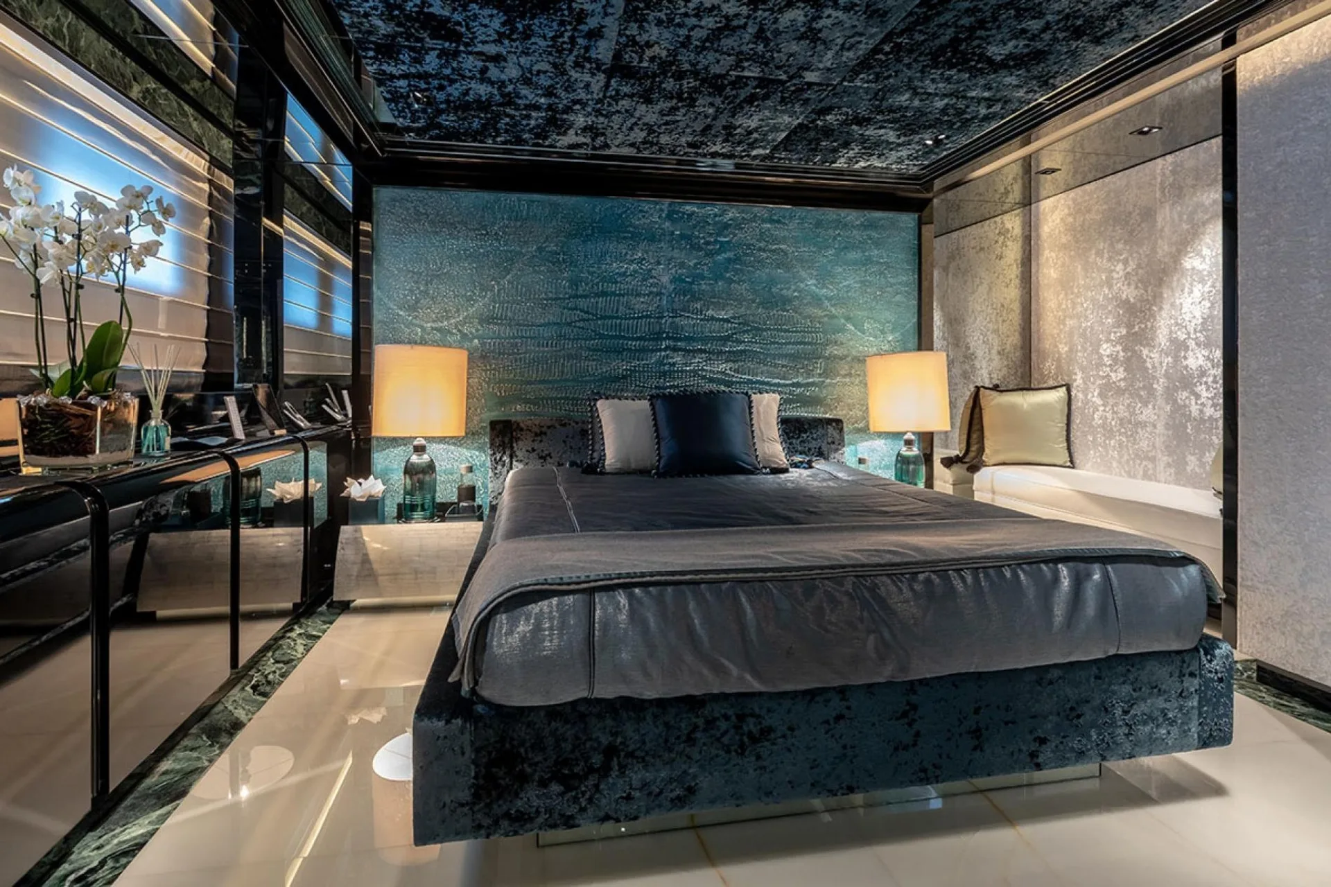 Designed for perfection, the yacht features lavish materials throughout. The main salon, equipped with back-lit onyx and a state-of-the-art Kaleidescape entertainment system, showcases fine marble floors and artistic furnishings. A striking Baldi amber crystal chandelier hangs above the dining table, with an onyx island that transforms into a bar.
