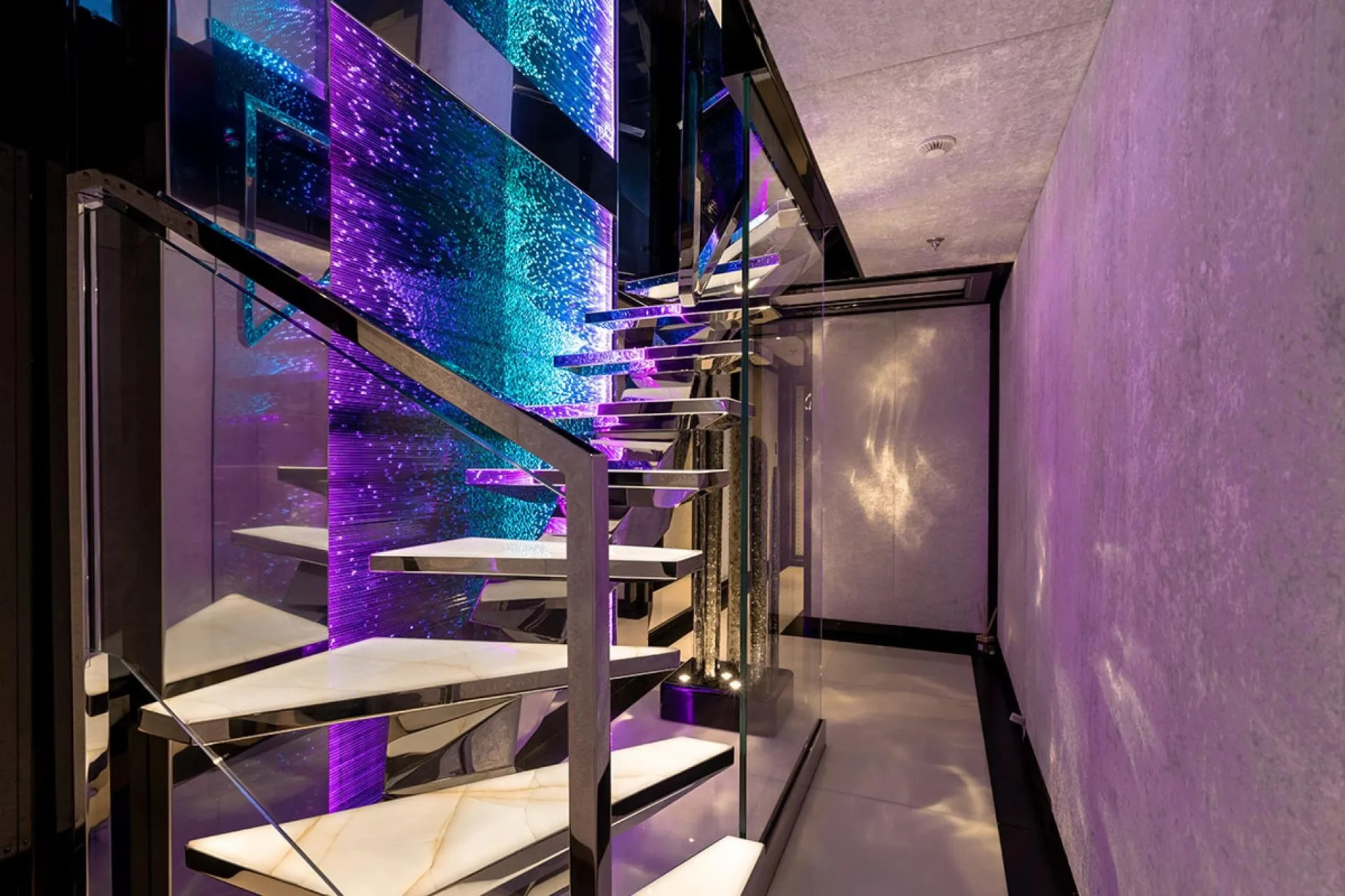 The bridge deck salon offers exquisite velvet and silk seating, impressive crystal tables, and a unique onyx dining option. Polished steel stairs with illuminated white onyx connect the decks, framed by an artistic ‘living sculpture’ by Lorenzo Malfatti.
