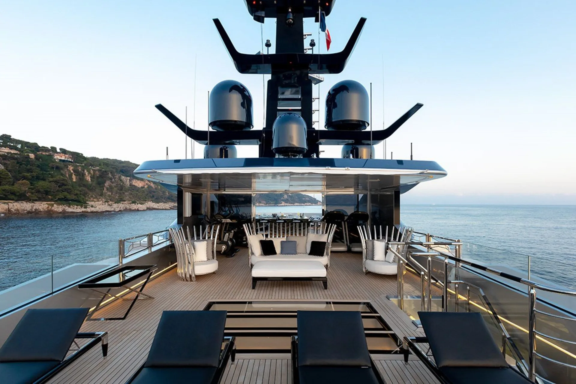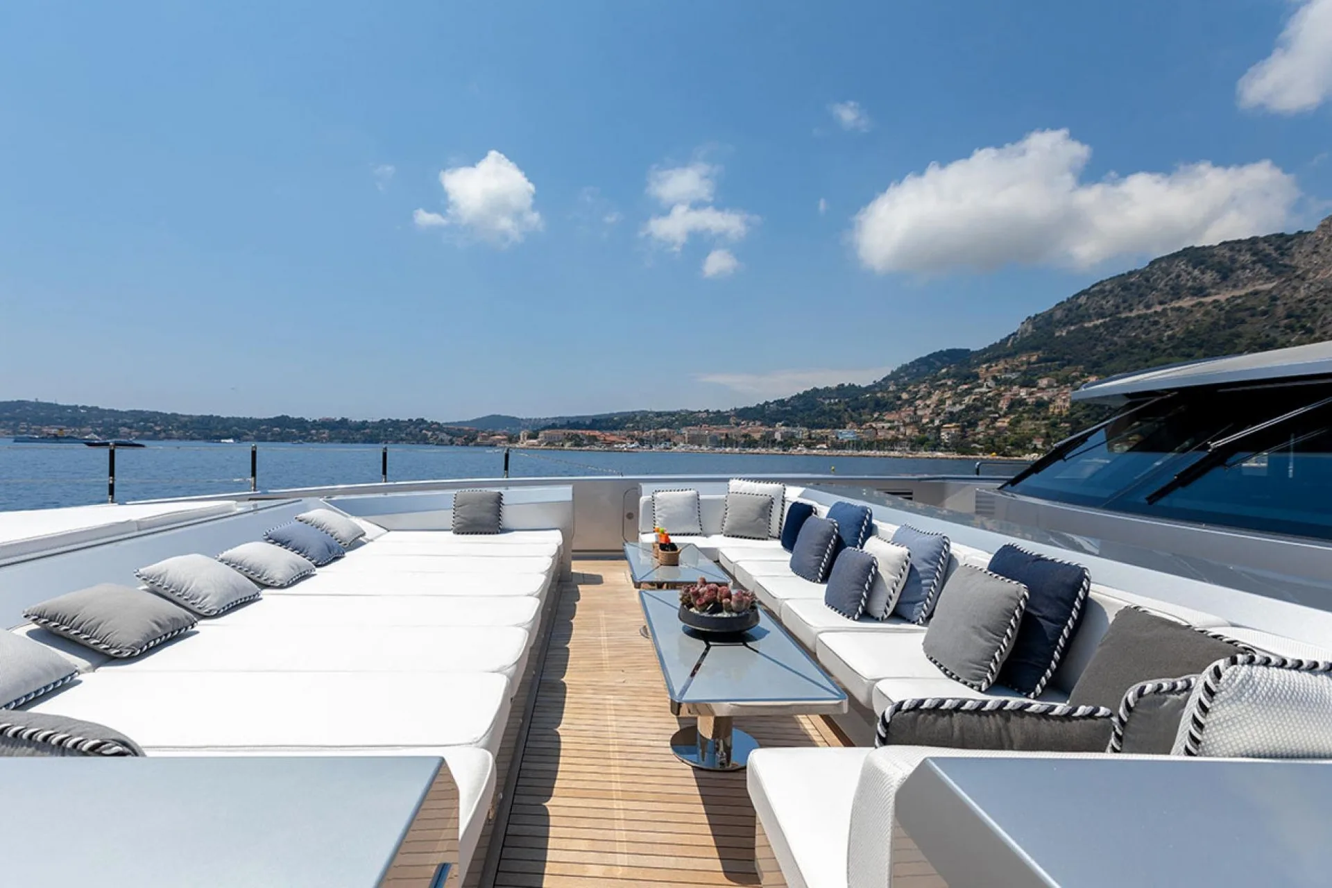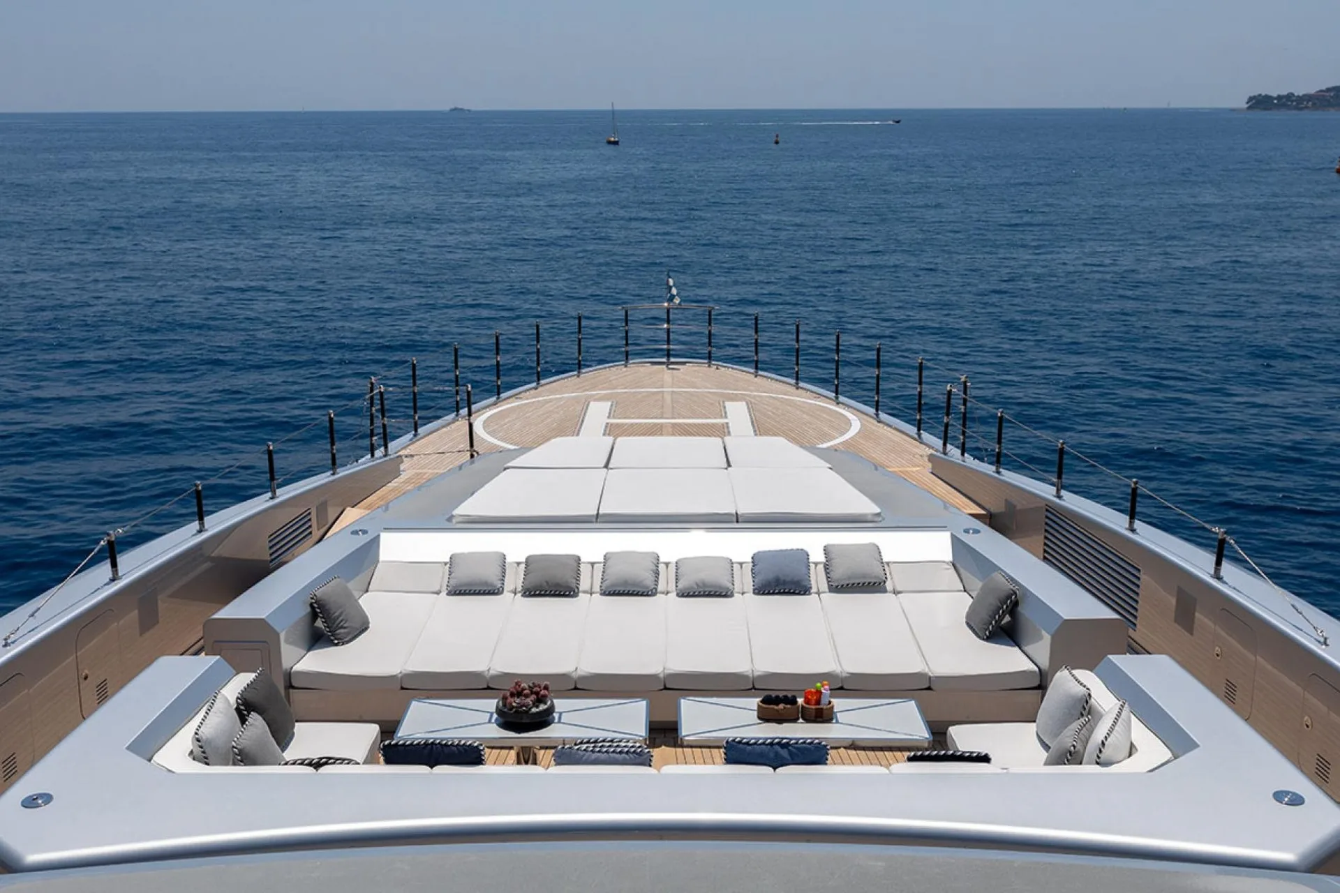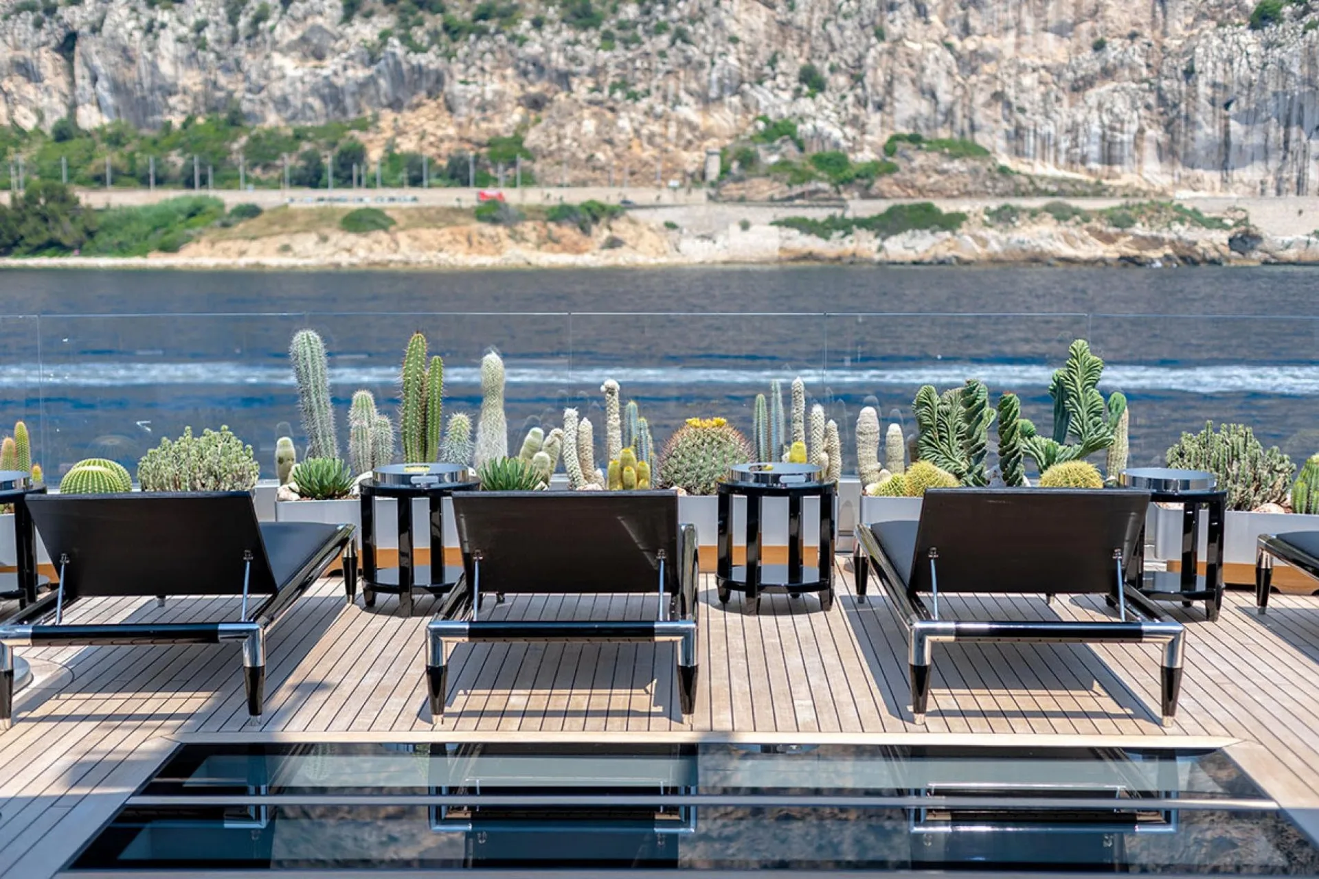 Outdoor spaces include a main deck with casual seating and stunning views, and a versatile foredeck that can serve as a dance floor or sunbathing area. The oversized glass-enclosed space features a bar, lounge, and workout area, perfect for sunny days and glamorous nights. Below, the beach club offers a private retreat and transforms into a vibrant alfresco bar in the evening.