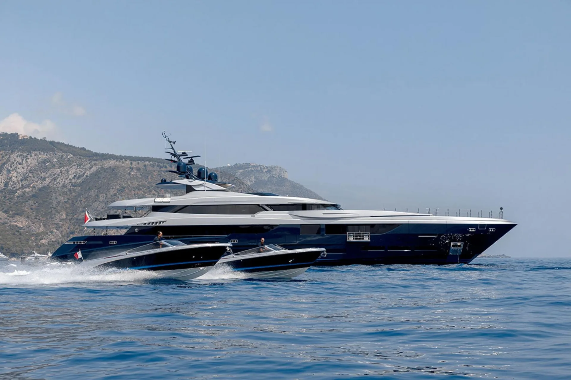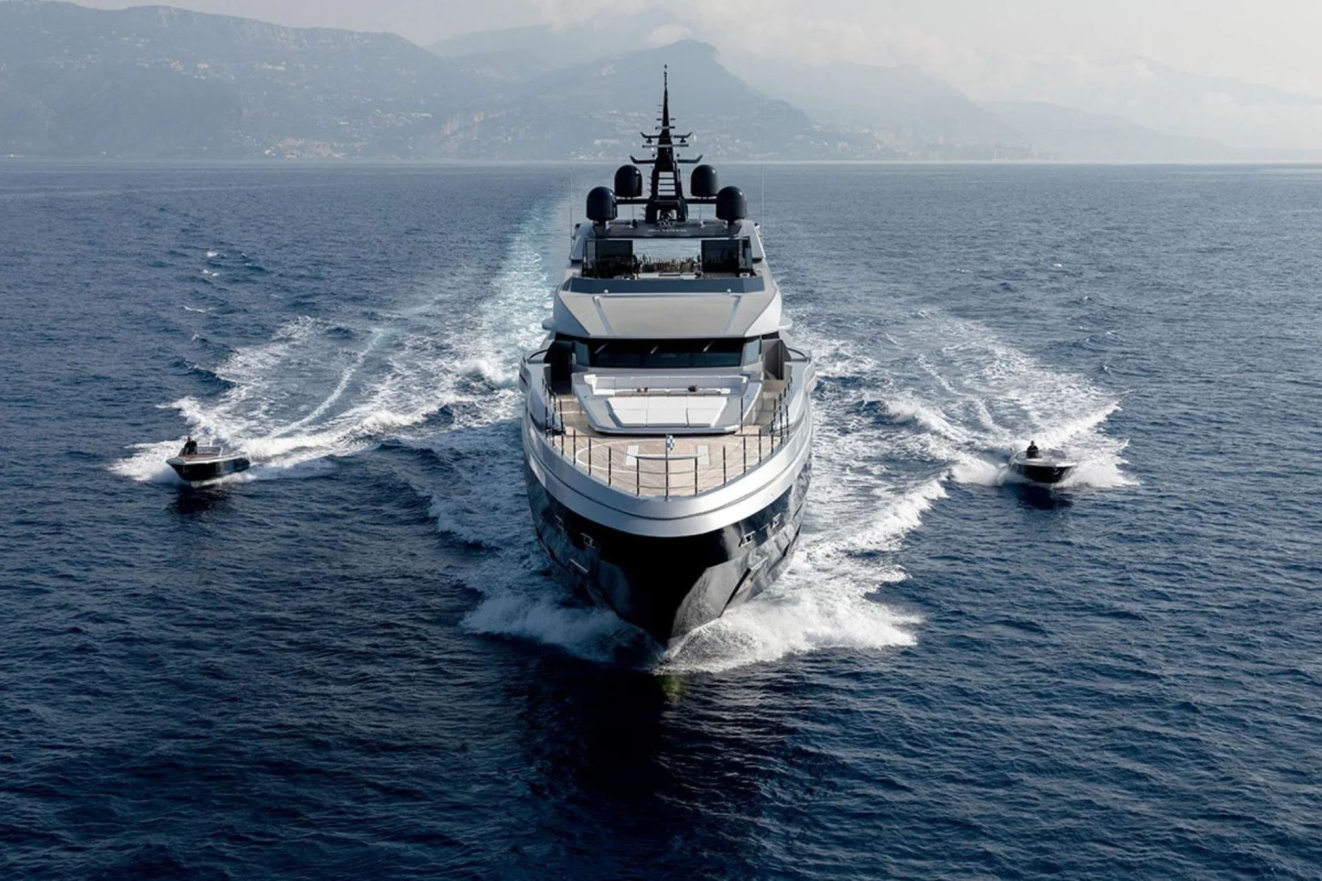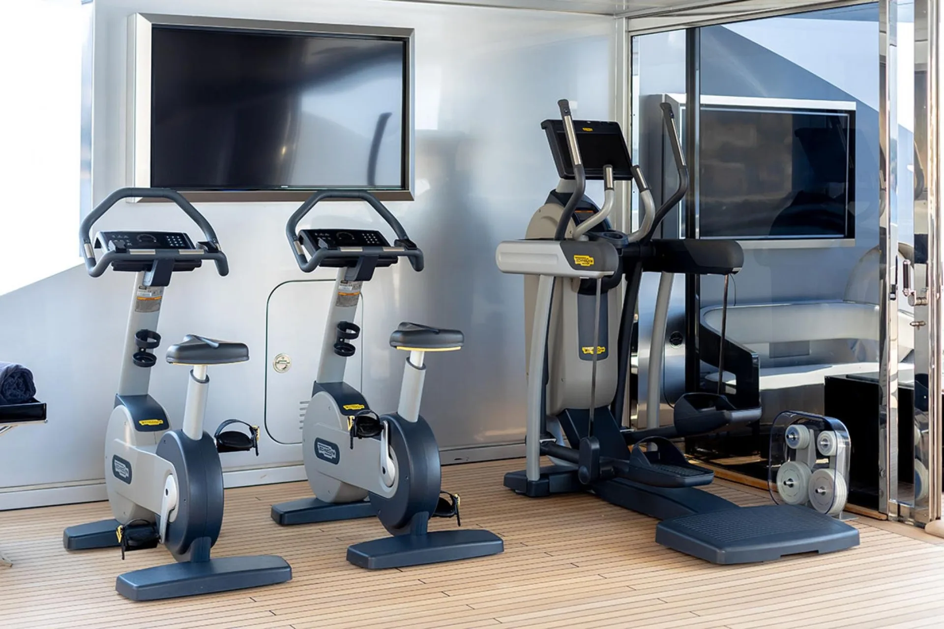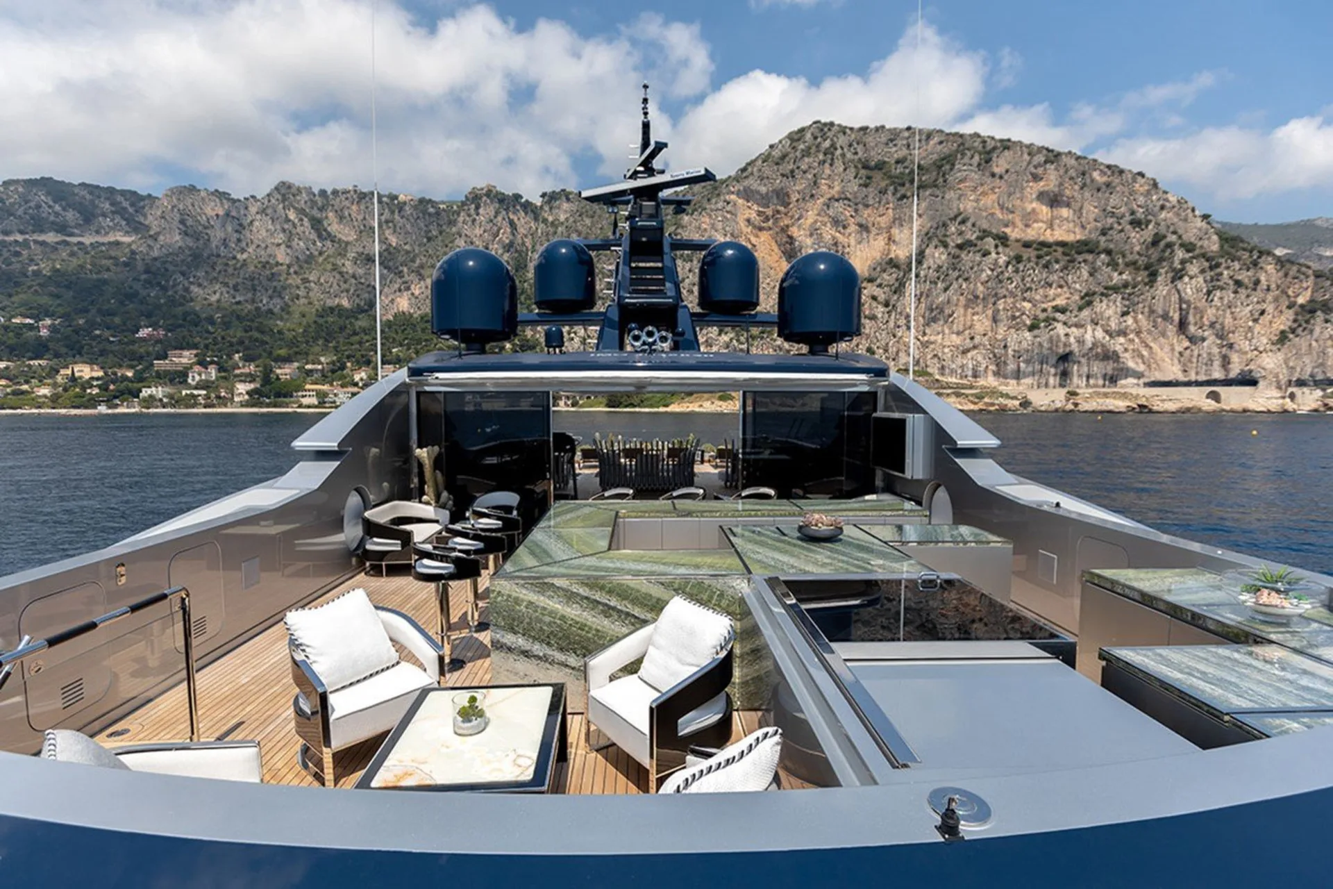 Outdoor spaces include a main deck with casual seating and stunning views, and a versatile foredeck that can serve as a dance floor or sunbathing area. The oversized glass-enclosed space features a bar, lounge, and workout area, perfect for sunny days and glamorous nights. Below, the beach club offers a private retreat and transforms into a vibrant alfresco bar in the evening.