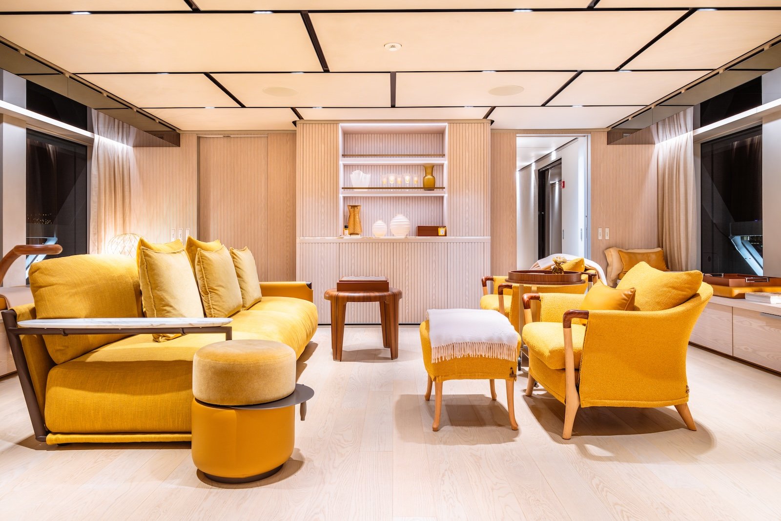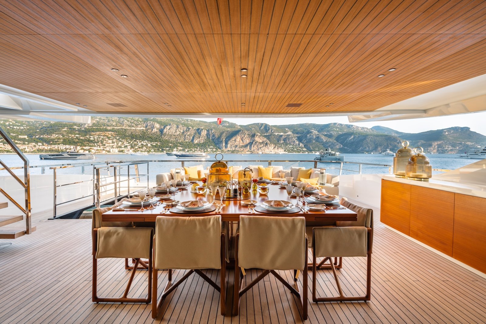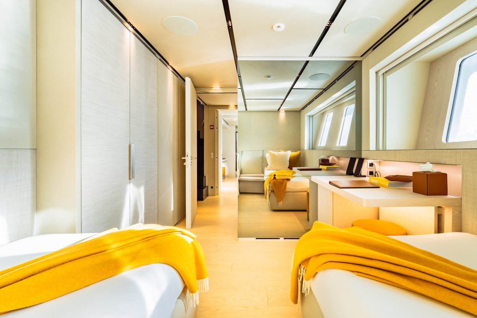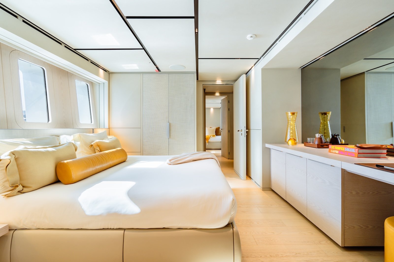 The Sanlorenzo 52 Steel has five beautifully designed cabins, providing comfortable accommodations for up to 10 overnight guests. It can also host 12 day guests, ensuring a luxurious experience for everyone on board. Inside, the yacht features modern fittings and comfortable furnishings, creating a sophisticated and welcoming atmosphere.