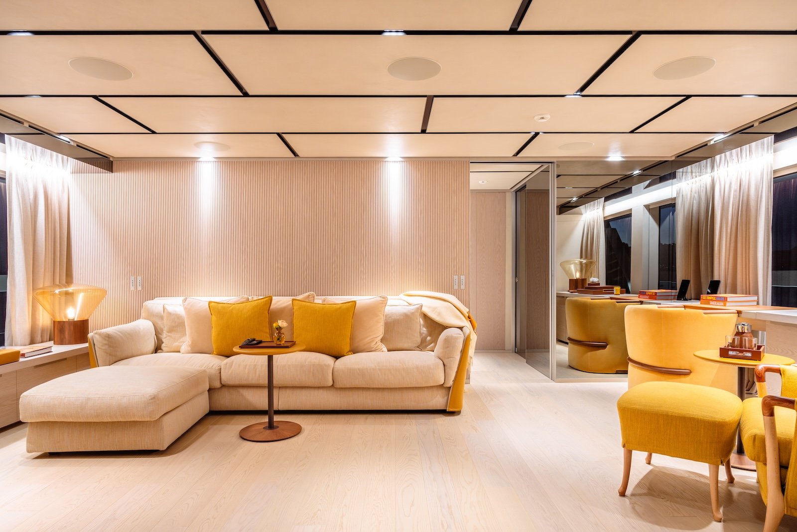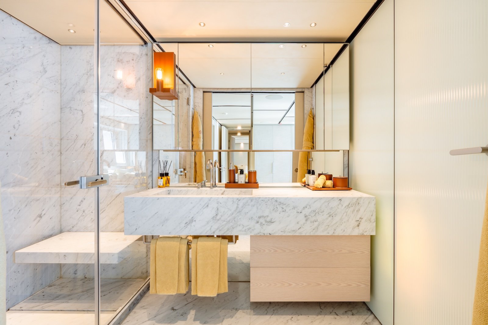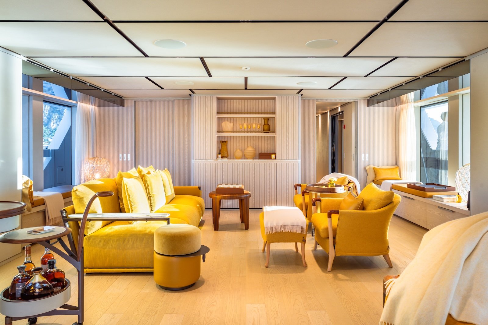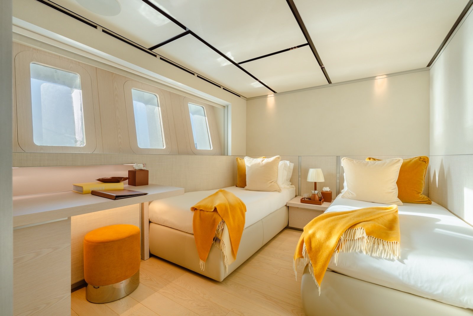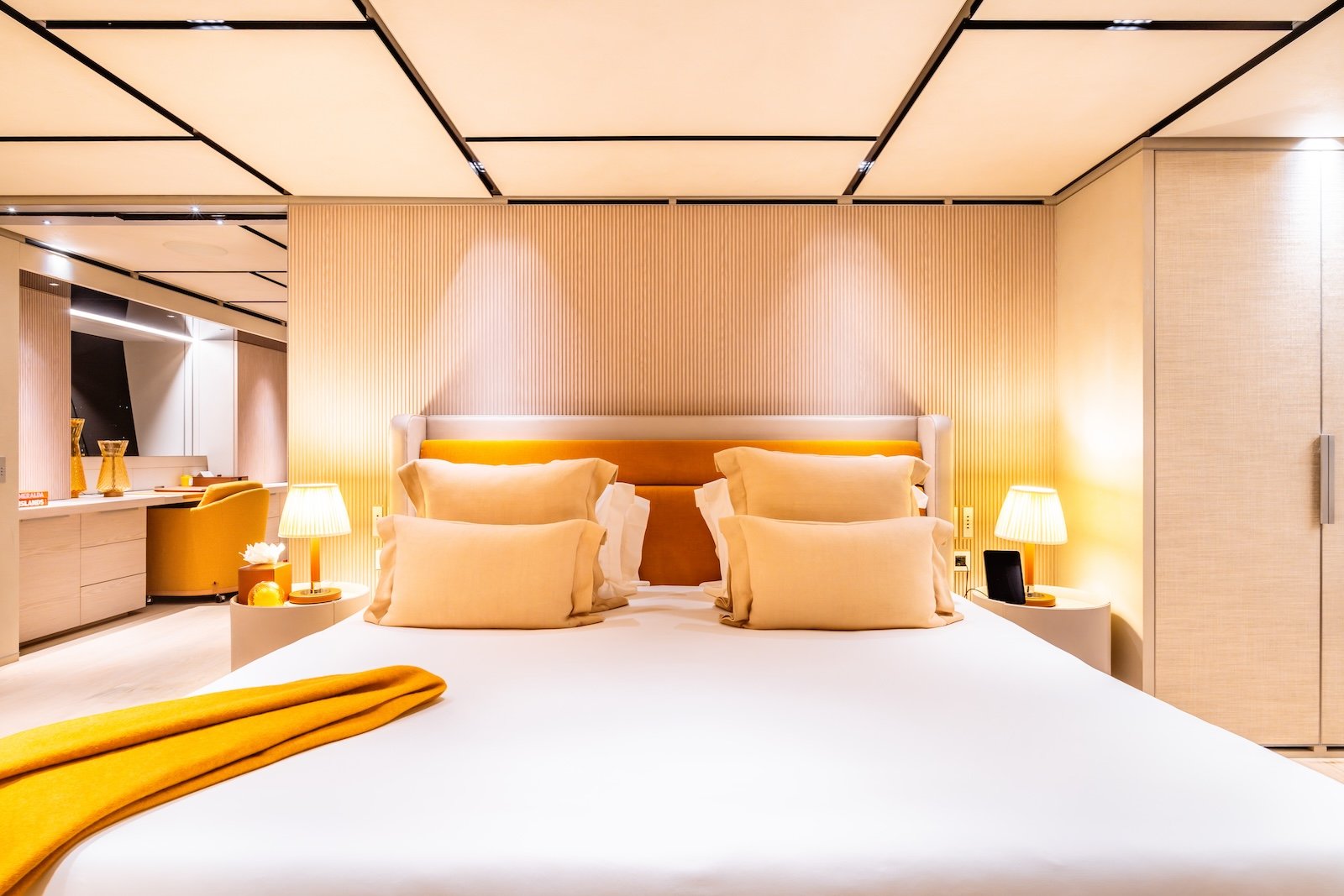 The Sanlorenzo 52 Steel has five beautifully designed cabins, providing comfortable accommodations for up to 10 overnight guests. It can also host 12 day guests, ensuring a luxurious experience for everyone on board. Inside, the yacht features modern fittings and comfortable furnishings, creating a sophisticated and welcoming atmosphere.