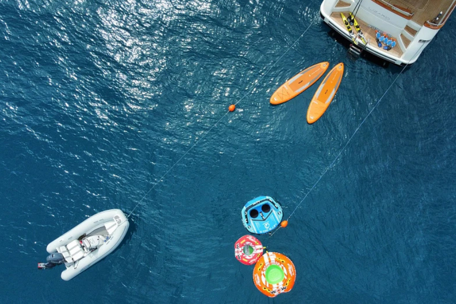 The exterior spaces provide ample room to unwind. The flybridge features an inviting row of cushioned sun pads, a forward helm station, and an open aft deck that doubles as tender storage while cruising. On the main deck aft, a stylish dining area sets the scene for al fresco meals, with direct access to the swim platform for effortless water access. The foredeck offers an additional sunbathing area with stunning panoramic views over the bow.