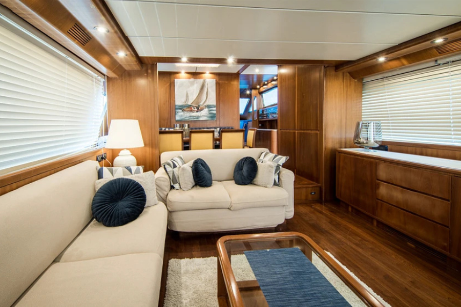 Inside, the Sanlorenzo 72 exudes timeless elegance, where neutral-toned furnishings complement warm wood paneling, creating an inviting and serene ambiance perfect for unwinding after a day of adventure.