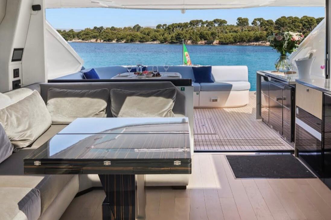 Outdoor areas include generous sunpads, a hydraulic swim platform, and a versatile garage for a tender or water toys. Powered by twin engines, it achieves a smooth cruising speed of around 24 knots, combining comfort, performance, and style in one seamless experience.